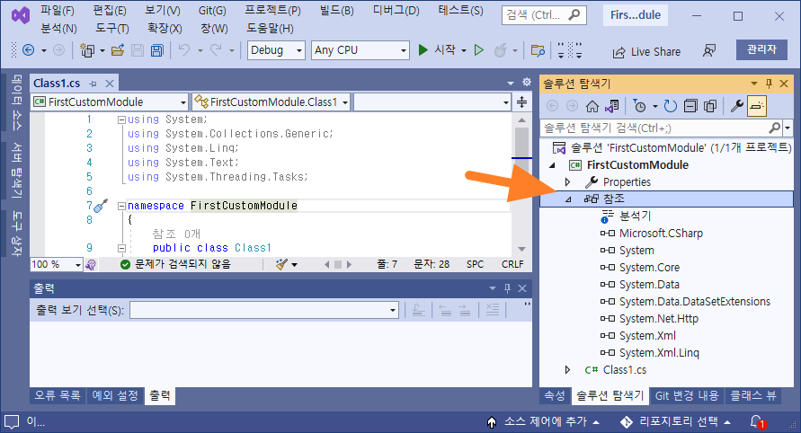 FirstCustomModule 프로젝트가 생성되고, 아래와 같은 기본 코드가 표시됩니다.