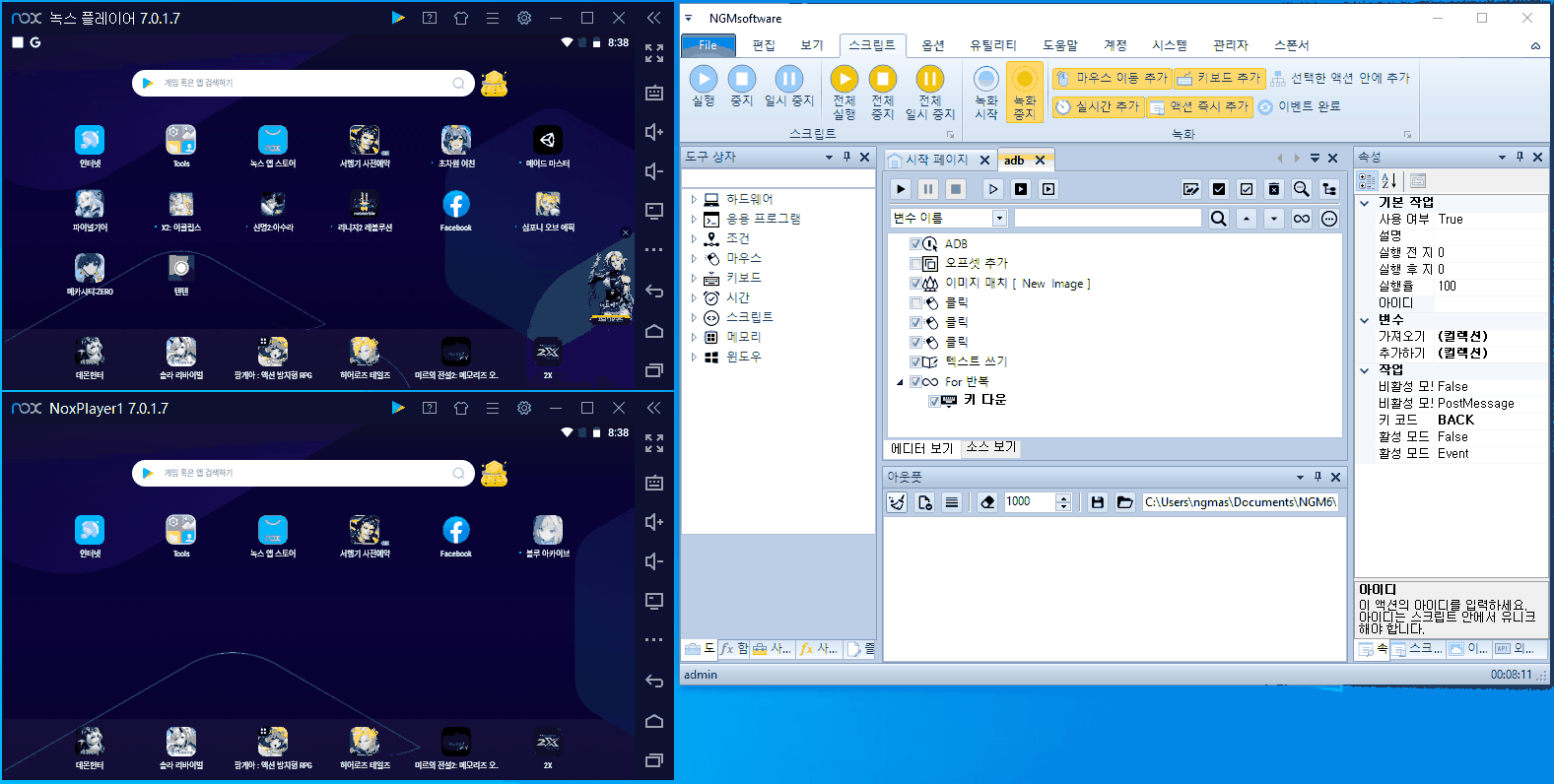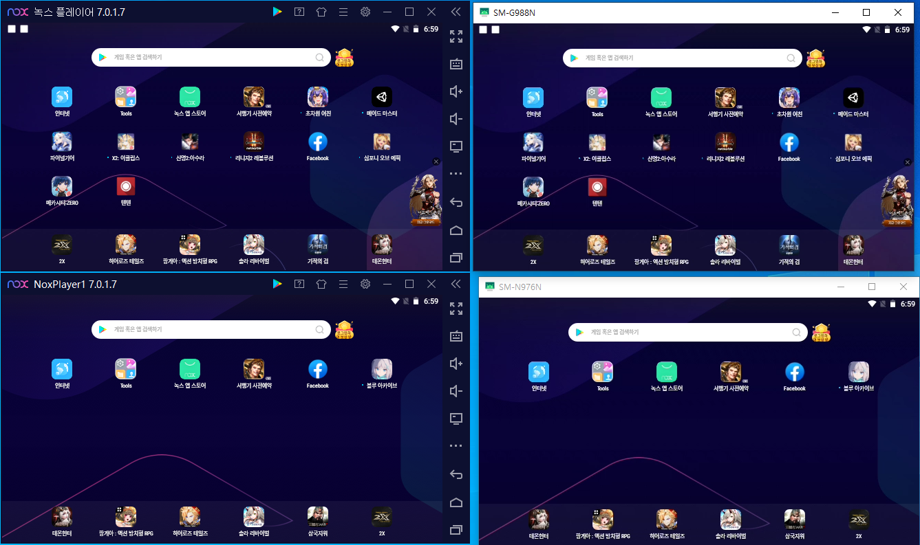 안드로이드 스마트폰이 없어서 녹스 앱플레이어를 연결해서 테스트 했습니다. 여러분들은 동일한 해상도를 가진 스마트폰을 USB로 연결하세요. 아래 그림은 좌측 상하로 녹스가 실행중입니다. 그리고, 우측 상하로 녹스를 미러링하는 SCRCPY가 실행중입니다.