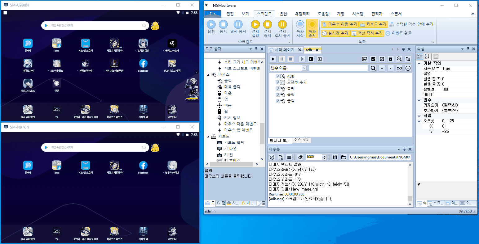 실행하면 ADB에 연결된 모든 안드로이드 기기에 클릭 신호가 들어갑니다. 연결된 기기가 10개면 10개 모두 동시에 신호를 받습니다.