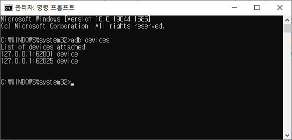 로컬 환경이므로 호스트(Host)는 127.0.0.1이고, 포트(Port)는 62001입니다. 호스트와 포트는 값은 윈도우 CMD에서 아래 명령으로 확인할 수 있습니다. 녹스가 2개 연결되어 있으므로 디바이스가 2개 표시됩니다. 만약, 디바이스가 하나도 없다면 현재 컴퓨터에 연결된 안드로이드 스마트폰이 없다는 뜻입니다.