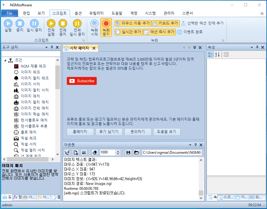 [ 텍스트 쓰기 ] 액션을 추가하세요. 그리고, 텍스트 속성에 NGMsoftware를 입력해줍니다. 아래 그림을 보면, [ For 반복 ]이 있습니다. 이 안에 [ 키 다운 ] 액션이 있는데요. For 반복에 조건 속성의 값을 12로 설정했습니다. 그리고, 그 안에 있는 키 다운 액션은 BACK(Back Space)입니다. 이 동작의 시나리오는 텍스트 쓰기로 NGMsoftware를 씁니다. 그리고, 12번 삭제키를 누릅니다. 결과적으로 텍스트를 쓰고, 모두 지웁니다.