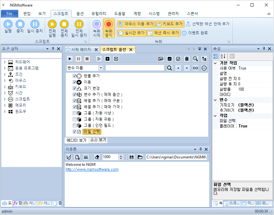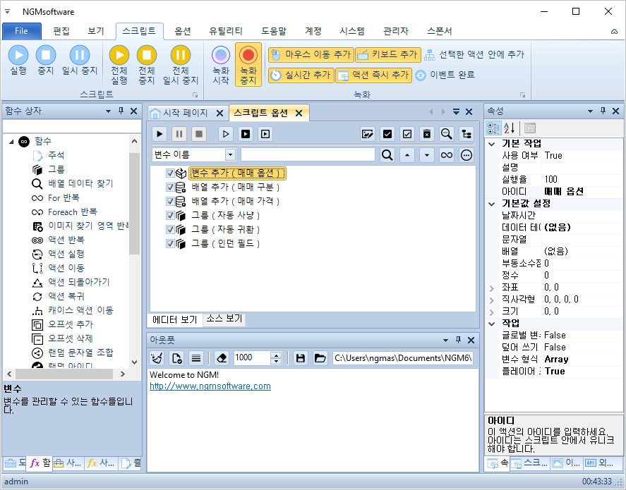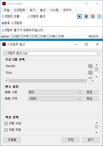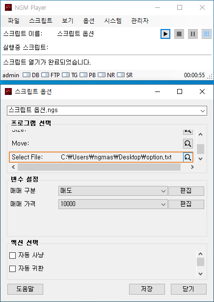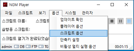 실제로 제작되는 스크립트는 이보다 더 복잡하겠지만, 플레이어에서 스크립트의 옵션을 어떻게 처리하는지를 알아보는 글이므로~ 간단한 예제 액션들만 추가 했습니다. 이제 엔지엠 매크로 플레이어를 실행하고, 동일한 스크립트를 열어줍니다. 그리고, 아래 그림과 같이 메뉴의 옵션 > 스크립트 옵션을 클릭하세요.