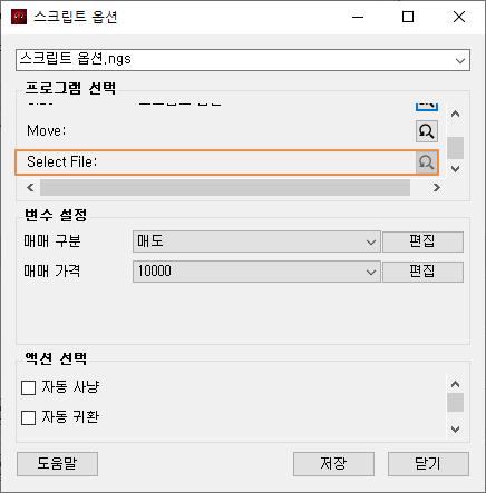 스크립트 옵션의 Select File은 파일 선택 액션을 추가하면 활성화 됩니다.