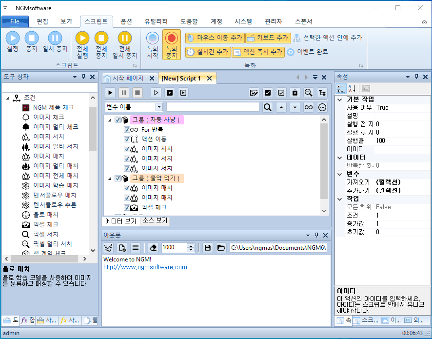 안녕하세요. 엔지엠소프트웨어입니다. 엔지엠 매크로 플레이어에는 스크립트를 제어할 수 있는 옵션들이 존재합니다. 매크로 제작자가 사용자에게 옵셔널(Optional)하게 설정을 변경하도록 해주는 기능입니다. 예를 들어서 스크립트를 A와 B로 동작할 수 있도록 만들었다면, 플레이어어 사용자는 A 또는 B로 동작하도록 직접 조작을 변경할 수 있다는 의미입니다. 엔지엠 에디터를 실행하고, 아래와 같은 스크립트를 하나 만들어줍니다. 첨부되어 있는 스크립트 옵션.ngs 스크립트를 열어도 됩니다.