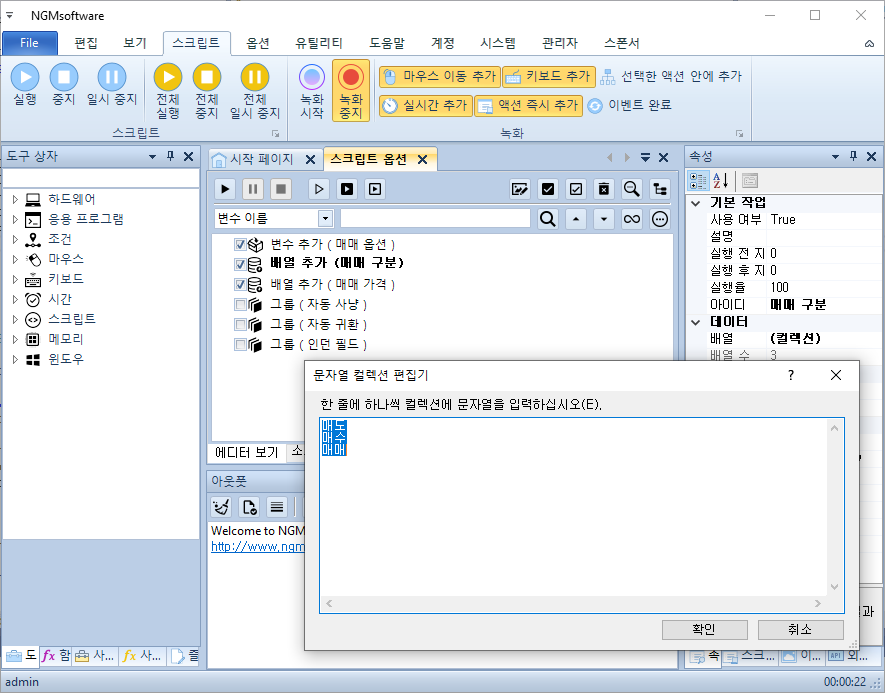 변수 설정 카테고리에는 [ 변수 추가 ], [ 배열 추가 ] 액션의 내용들이 표시됩니다. 변수의 경우 초기 값을 변경할 수 있습니다. 예를 들어 주식 매매 금액이 1000이더라도 사용자마다 매매 금액을 다르게 설정하고 싶을겁니다. 제작자가 사용자의 요구에 따라 매번 스크립트를 수정해서 보내줄수는 없기 때문에 이런 부분들은 변수로 처리하고, 스크립트 옵션에서 사용자가 직접 변경해서 쓰도록 해야 합니다.