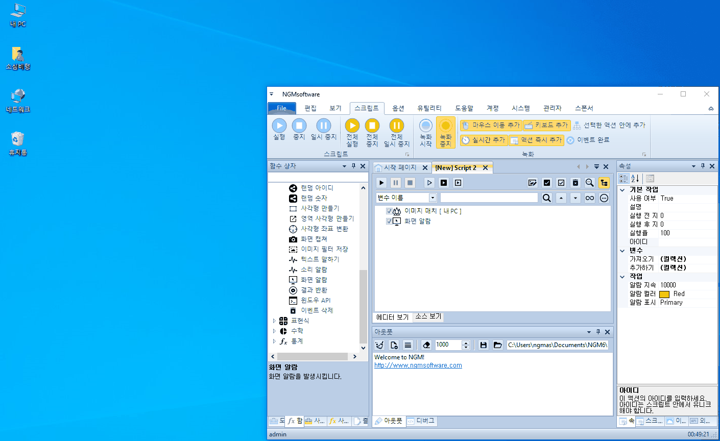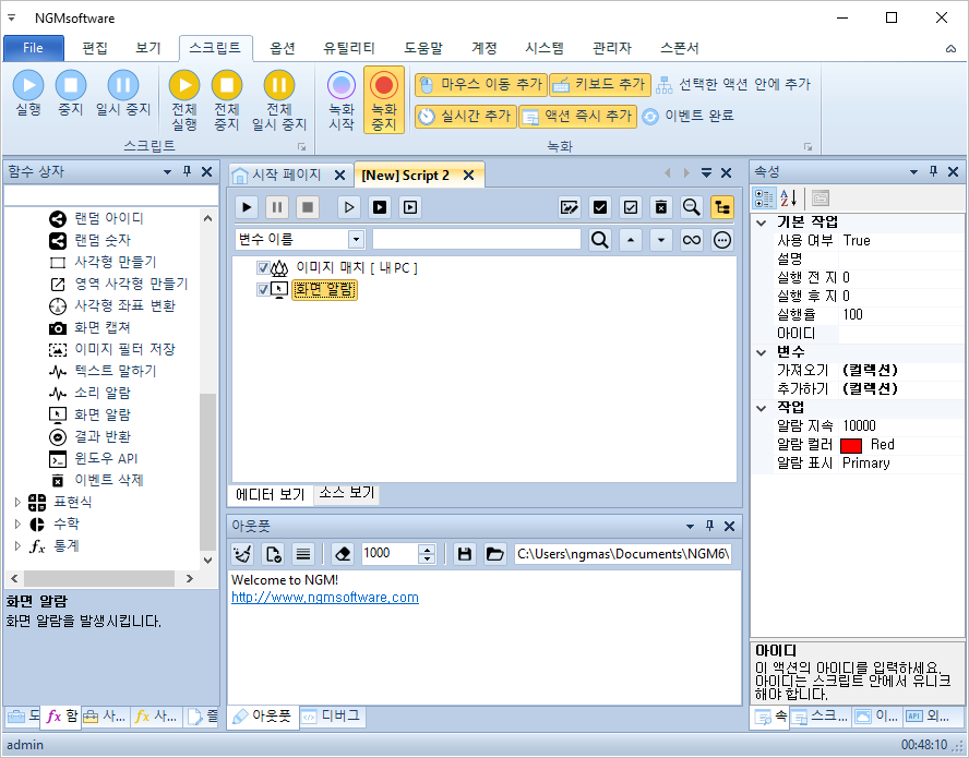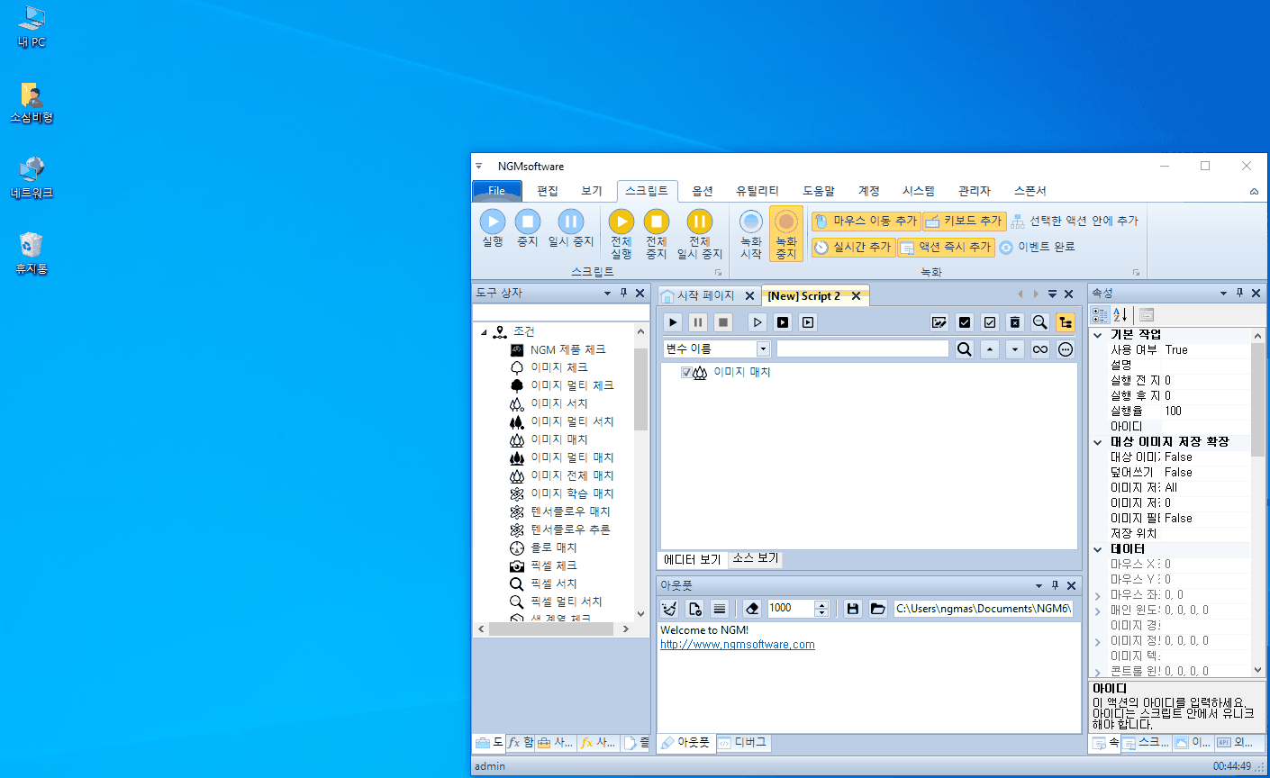 안녕하세요. 엔지엠소프트웨어입니다. 오늘은 간단하게 윈도우 화면에서 이미지를 찾으면 알림 또는 알람을 발생시키는 방법에 대해 알아보도록 하겠습니다. 우선, 엔지엠 에디터를 실행하고 새로운 스크립트를 추가하세요. 그리고, [ 이미지 매치 ] 액션을 하나 추가 해줍니다.