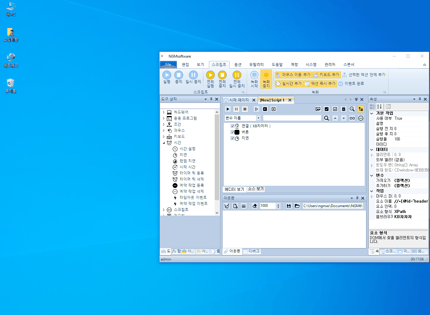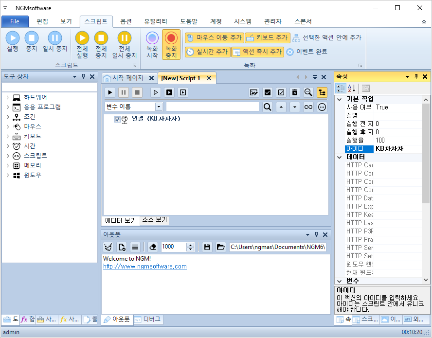 오늘 배울 내용을 통해서 웹크롤링을 어떻게 만드는지 이해할 수 있을겁니다. 또한, 이정도 학습하면 혼자서 얼마든지 응용해서 사용할 수 있을거예요^^; 우선, 엔지엠 에디터를 실행하고 새로운 스크립트를 추가 해줍니다. 그리고, 웹 API에서 [ 연결 ] 액션을 스크립트에 추가하세요.