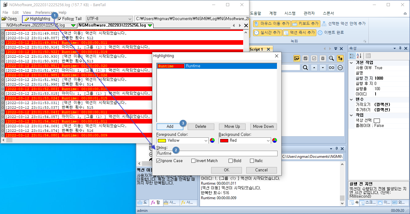 로그 모니터링 도구를 사용하는 이유는 계속해서 갱신되는 로그 파일에서 원하는 특정 키워드가 검색되면 쉽게 확인하기 위한 용도입니다. 아래 그림과 같이 ①Highlighting을 클릭하세요. 하이라이팅할 키워드를 등록할 수 있는 창이 표시됩니다. ②Runtime을 입력하고, ③Add 버튼을 눌러서 추가합니다. 이 키워드가 검출될 때 하이라이트 처리되는 글자색과 배경색을 설정 해줍니다.