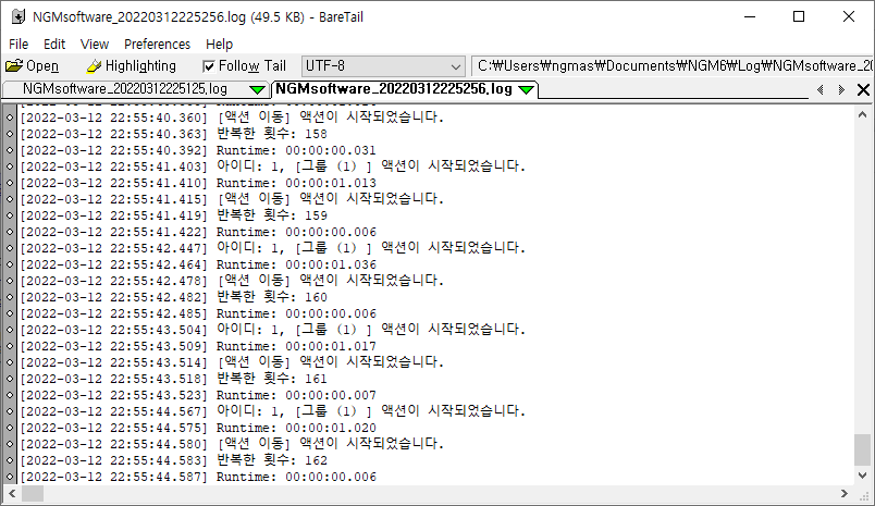 현재 기록중인 파일을 선택하면 로그가 기록될 때마다 베어 테일에서 갱신되는걸 확인할 수 있습니다.