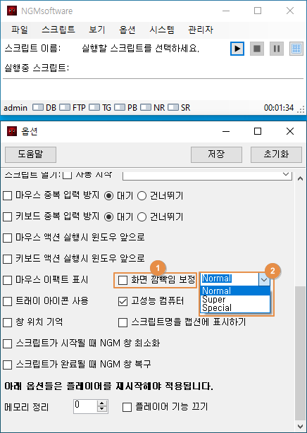 안녕하세요. 엔지엠소프트웨어입니다. 일부 프로그램이 실행중일 때 이미지 조건의 캡쳐 또는 이미지 조건(이미지 체크, 이미지 서치, 이미지 매치등등...)이 정상적으로 동작하지 않는 경우가 있습니다. 이런 경우에는 아래와 같이 에디터의 옵션에서 캡쳐 모드를 변경할 수 있습니다.