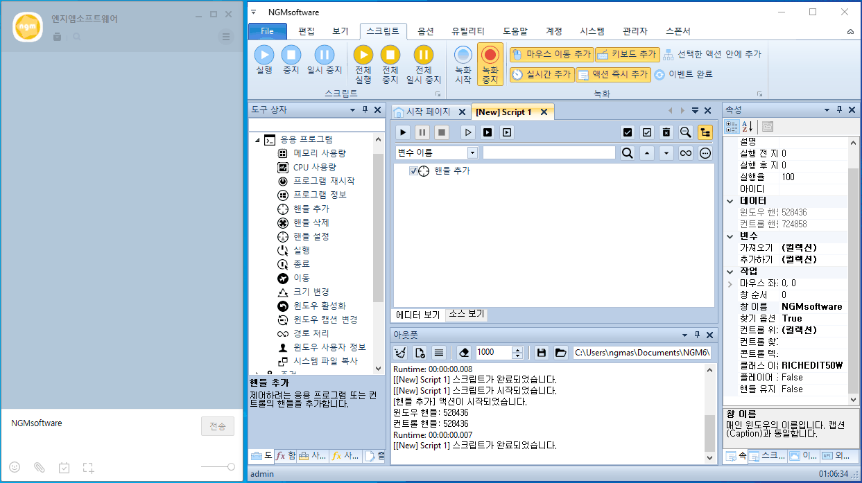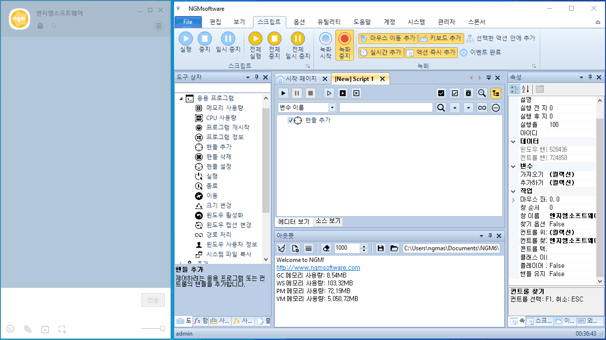 자동차를 운행하기 위해 핸들을 조작하죠? 어떤 프로그램을 조작하려면 핸들 값을 알아내서 이 핸들로 프로그램을 제어해야 합니다. 우리가 조작하는 대부분의 것들을 핸들이라고 부릅니다. 문을 열 때 손잡이나 서랍 손잡이등등... 아무튼 그렇습니다. 비활성 매크로를 만들려면 핸들을 알아내는게 가장 중요한 작업중에 하나입니다. 이 테스트를 위해 카카오톡 대화방을 열고, 엔지엠 에디터도 실행 해줍니다.