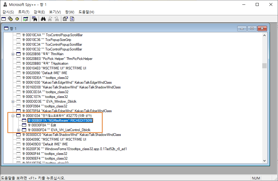 핸들 값은 프로그램을 실행시킬 때 윈도우가 중복되지 않게 고유한 아이디를 발급합니다. 그러므로 윈도우에서 이 값이 중복되는 일은 발생하지 않습니다. 다만, 핸들 값이 프로그램을 실행할 때 윈도우에서 발급하기 때문에 다음에 다시 실행할 때 이 값이 변경되게 됩니다. 그래서, 엔지엠 매크로는 아래와 같이 프로그램명으로 구조를 찾아나가게 설계되어 있습니다. 카카오톡은 구조가 단순해서 엔지엠 에디터를 잠깐 선택 했습니다^^