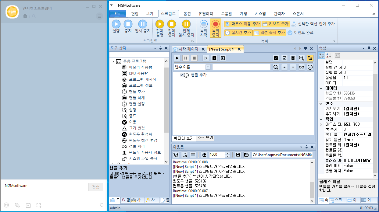 핸들을 추가(속성창 > 콘트롤 찾기 > F1 선택)하면 속성창의 데이터에 매인 핸들과 콘트롤 핸들이 자동으로 입력됩니다. 여기서 윈도우 핸들은 카카오톡 채팅창을 말하고, 콘트롤 핸들은 사용자가 선택한 채팅 입력하는 곳의 콘트롤입니다.