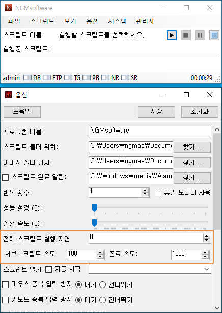 전체 스크립트 실행 지연은 여러개의 스크립트를 동시에 실행할 때 사용하는 옵션입니다. 스크립트 1, 스크립트 2, 스크립트 3... 과 같이 여러개의 스크립트를 열고 실행 버튼을 누르면 모든 스크립트가 동시에 실행됩니다. 이 때 각각의 스크립트는 비동기로 실행할 수 있는 스레드를 할당 받게 됩니다. 이 때 알 수 없는 문제로 스레드에서 사용할 리소스가 겹치게되면 메모리가 해제되지 않습니다. 그래서, 일정한 간격을 두고 리소스를 모두 불러올 수 있도록 해줘야 합니다. 멀티 스크립트 실행에 문제가 있으면 이 값을 늘려줘야 합니다. 서브 스크립트 속도와 종료 속도는 매인 스크립트에서 서브 스크립트를 실행할 때 그리고, 종료될 때 속도를 말합니다. 멀티 스크립트 환경에서 서브 스크립트가 있을 때 또는 비동기 서브 스크립트를 사용할 때 이 값을 늘려야 합니다. 싱글 스크립트에 서브 스크립트를 사용하는 경우 이 값은 실행과 종료에 1 또는 10을 입력하고 사용하는게 효율적입니다. 속도에 문제가 있다면 100을 입력하고 사용하세요.