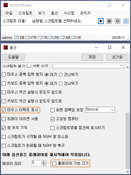 플레이어 보기 메뉴의 옵션을 보면 다양한 편의 기능들을 키거나 끌 수 있습니다. 마우스 이펙트 보이기를 끄고 사용하세요. 그리고, 플레이어 기능 끄기에 체크하세요. 아래 그림은 반대로 되어 있습니다만, 여러분들은 제대로 설정하실거라 생각합니다. 설정 변경 후 꼭 저장 버튼을 눌러야 합니다. 그리고, 일부 옵션은 플레이어를 재시작해야 적용됩니다. 매크로를 실행하는데 문제가 없다면 옵션은 기본값에 플레이어 기능 끄기만 체크하고 사용하세요.