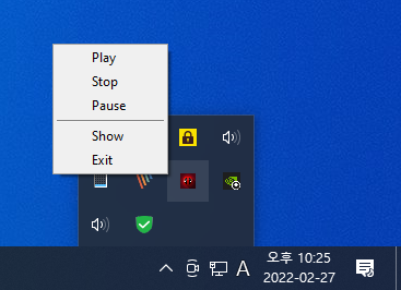 옵션에 트레이 아이콘 사용에 체크하면 플레이어는 아래 그림과 같이 트레이 영역에만 표시됩니다. 플레이어를 다시 표시하려면 Show를 누르면 됩니다. 플레이어가 트레이 영역에 있더라도 스크립트를 실행하거나 중지할 수 있습니다. 물론, 종료도 가능합니다.
