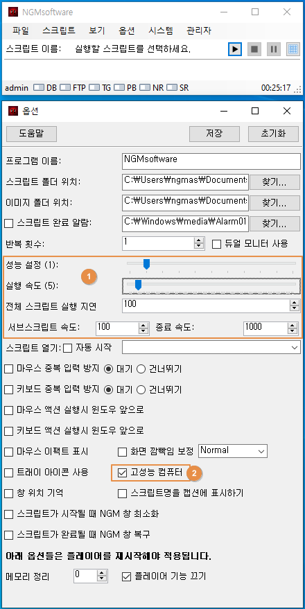 아래 그림을 참고해서 컴퓨터 성능에 맞게 플레이어 속도를 조정해줍니다. ①이 옵션들은 스크립트 실행 속도가 저하되는 대신 컴퓨터의 부담(CPU & Memory)을 줄여줍니다. ②고성능 컴퓨터에 체크를 해제하면 이미지 분석 속도가 느려집니다. 대신에 이미지를 분석하기 위한 CPU 사용량을 줄일 수 있습니다. CPU와 메모리 사용량이 60%를 넘는다면 이 옵션의 사용을 고려해봐야 합니다.