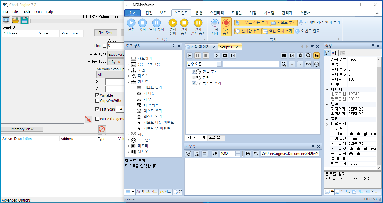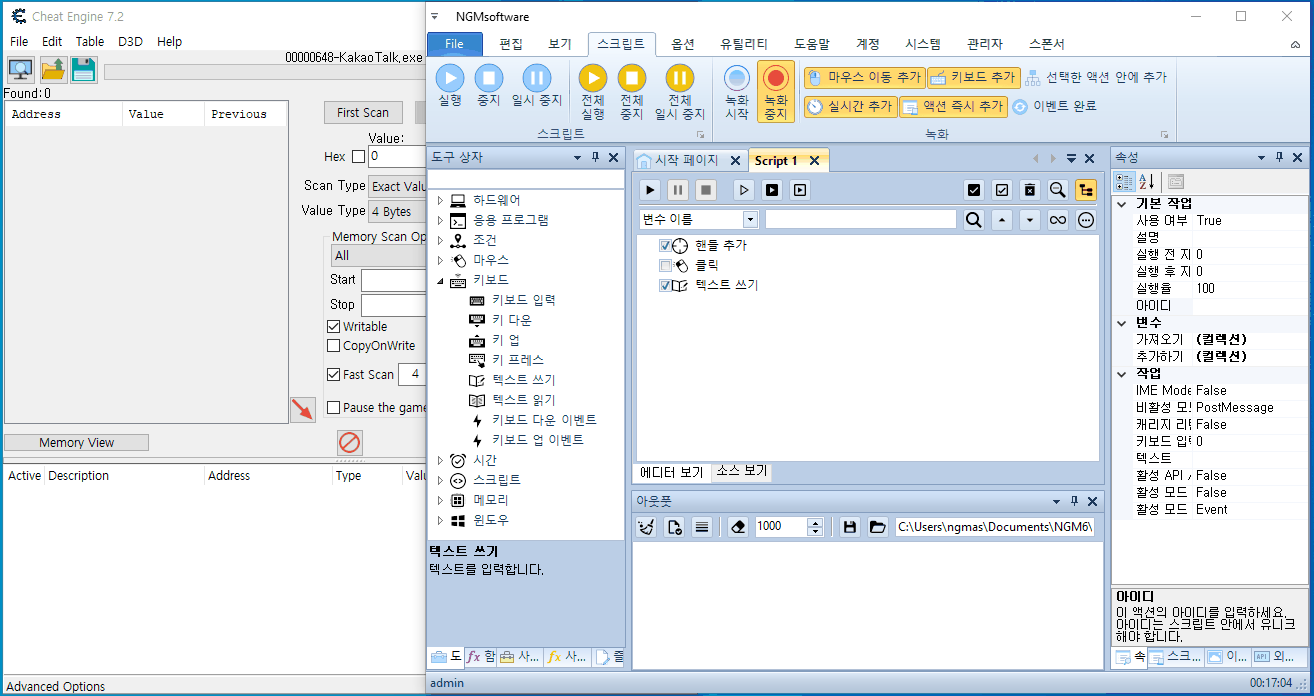 키보드 입력은 선택한 콘트롤이 Input(Edit) 타입이어야 합니다. 우선, 테스트를 위해 아래와 같이 [ 텍스트 쓰기 ] 액션을 추가하세요.