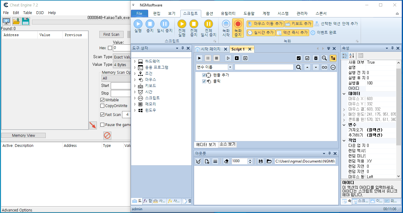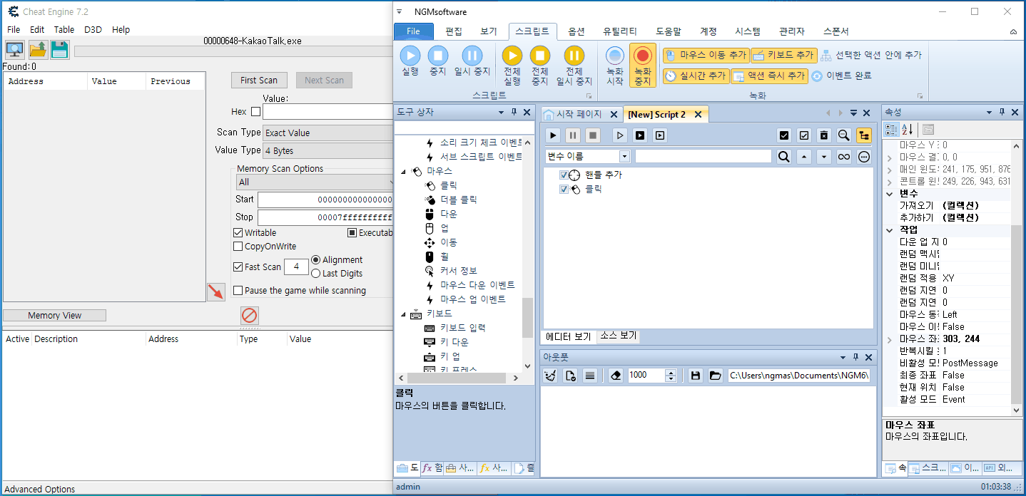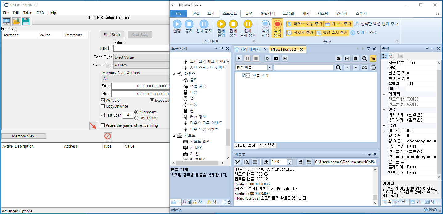 활성 매크로와 차이점을 확인하려면 핸들 추가 액션이 동작하지 않도록 체크를 해제하고 다시 실행해보면 됩니다. 활성 매크로는 마우스가 직접 이동해서 클릭했습니다.