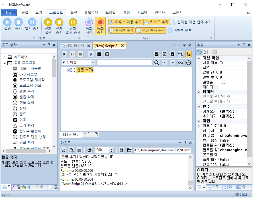테스트를 위해 엔지엠 에디터를 실행하세요. 그리고, 새로운 스크립트를 하나 추가하고 [ 핸들 추가 ] 액션을 추가하세요.