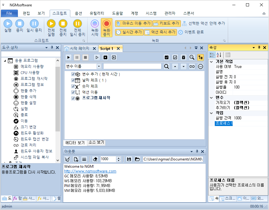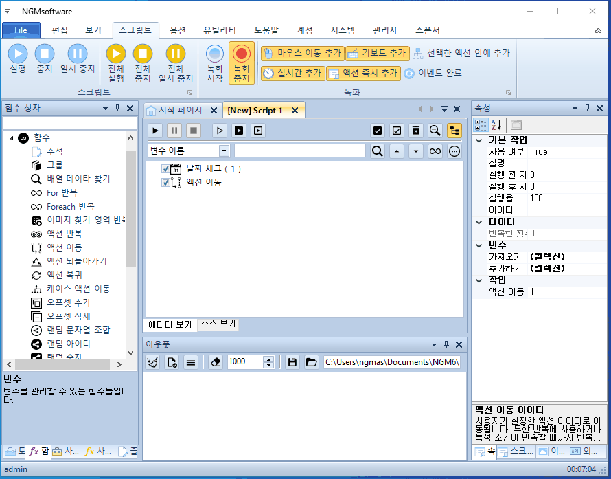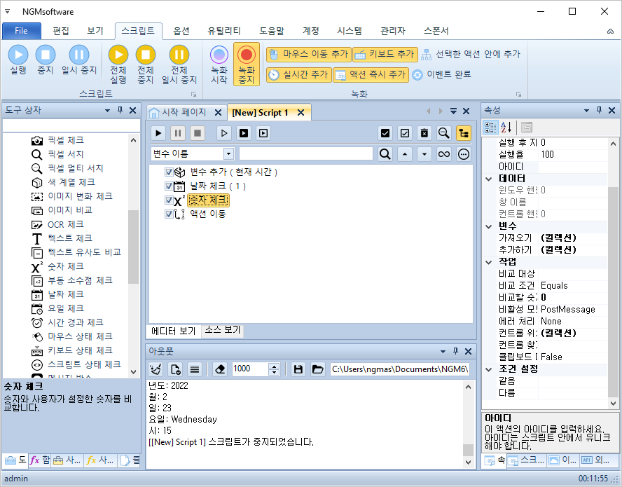 안녕하세요. 엔지엠소프트웨어입니다. 엔지엠 매크로를 매일 일정 시간마다 재시작하는 방법에 대해 알아보도록 하겠습니다^^ 우선, 엔지엠 에디터를 실행하고 새로운 스크립트를 하나 추가하세요. 그리고, 시간을 알아내기 위해 아래 그림과 같이 [ 날짜 체크 ] 액션을 하나 추가 해줍니다.