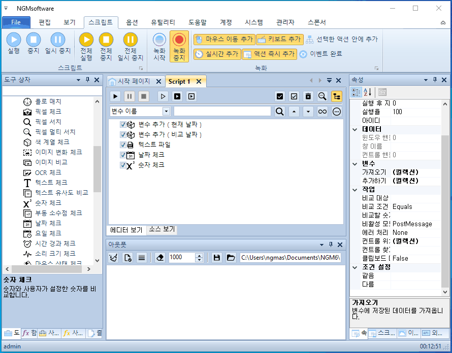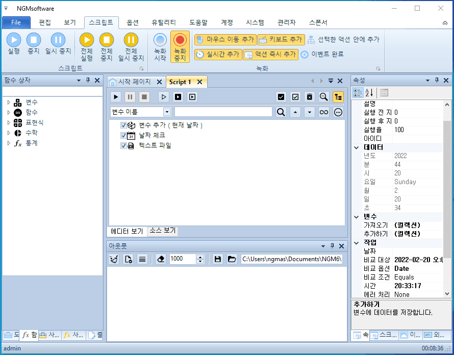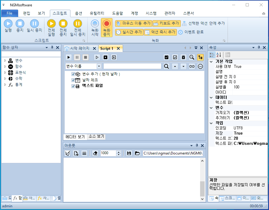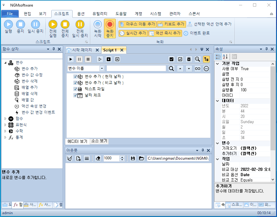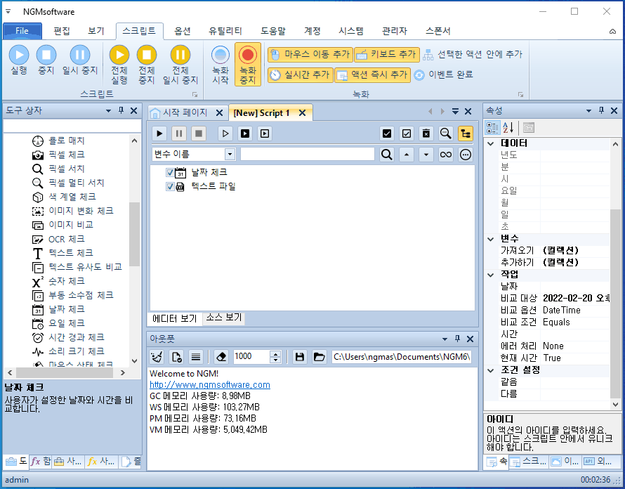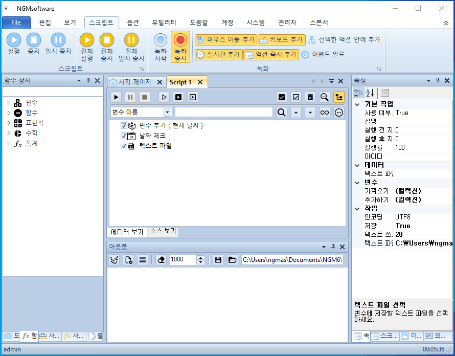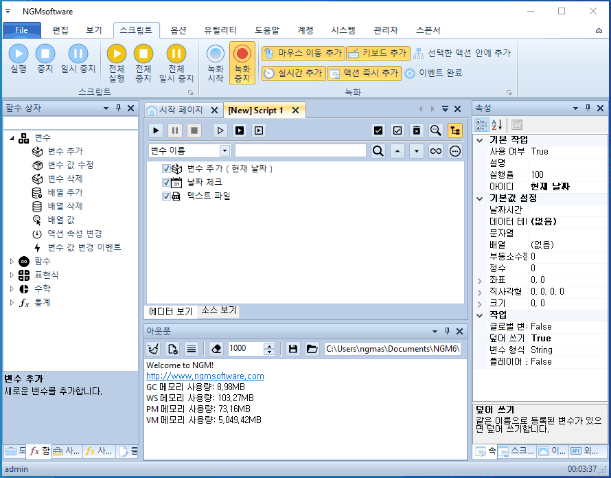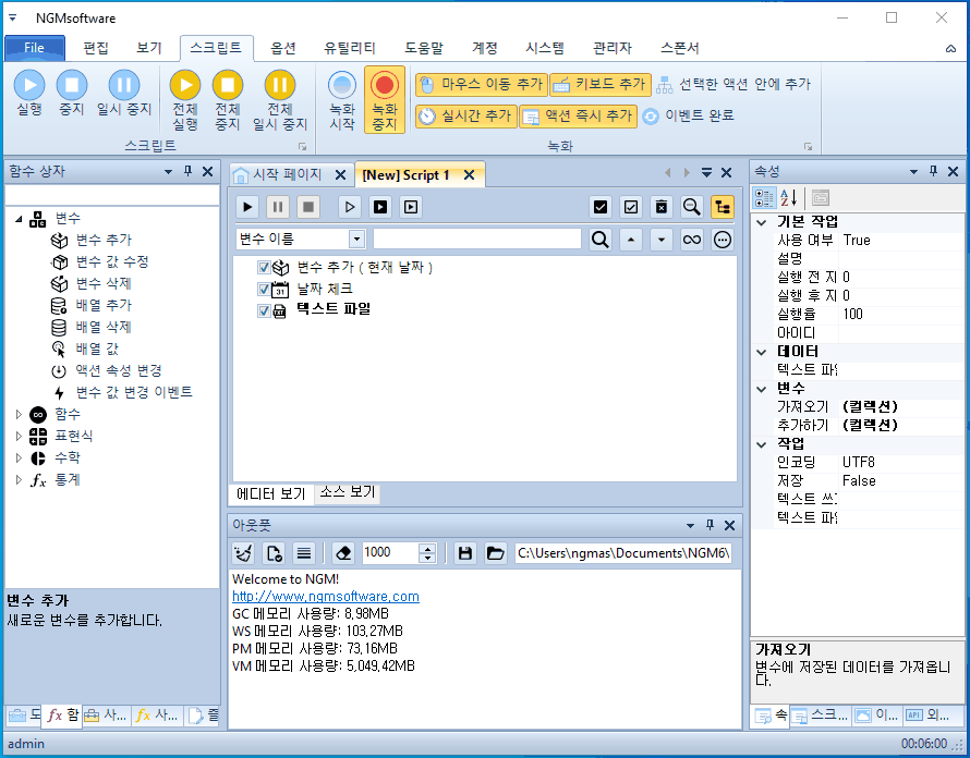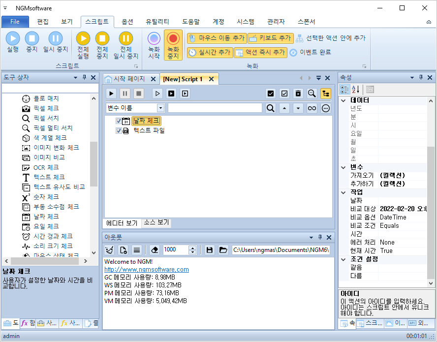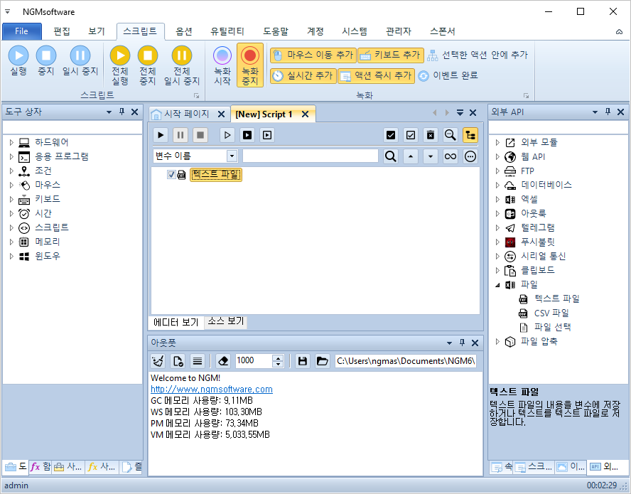 안녕하세요. 엔지엠소프트웨어입니다. 매크로에 스크립트가 1부터 5까지 있다고 생각 해보세요^^; 여기서 1번 스크립트만 하루에 한번만 실행해야 하는 경우 어떻게해야 할까요? 처음 매크로를 접하게 되면 난감할거라 생각합니다. 전체 스크립트에서 1번만 하루에 한번 실행하고, 나머지는 계속 실행되어야 하니까요. 자~ 이런 경우에는 1번 스크립트가 오늘 실행되었는지 체크할 수 있는 무언가가 필요합니다. 이 예제에서는 바탕화면에 텍스트 문서를 하나 만들고, 여기에 날짜를 입력해서 오늘과 같은지 비교하는 방법을 사용할겁니다. 엔지엠 매크로를 실행하고 우측 외부 API의 파일 > [ 텍스트 파일 ]을 하나 추가하세요.