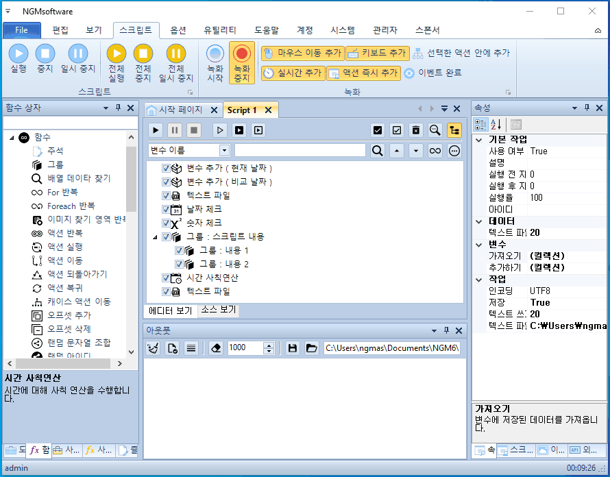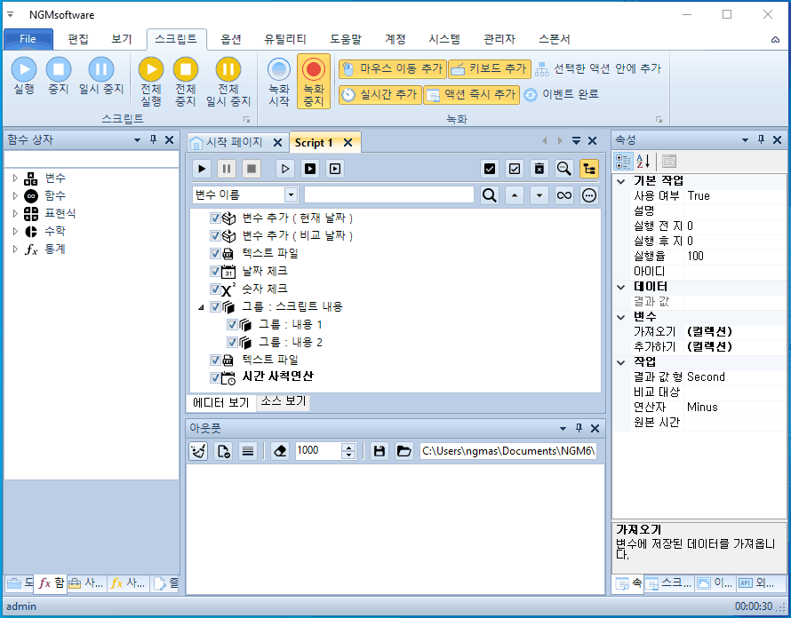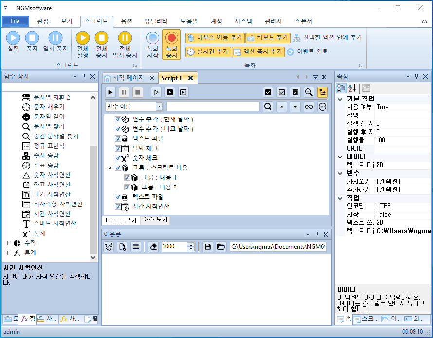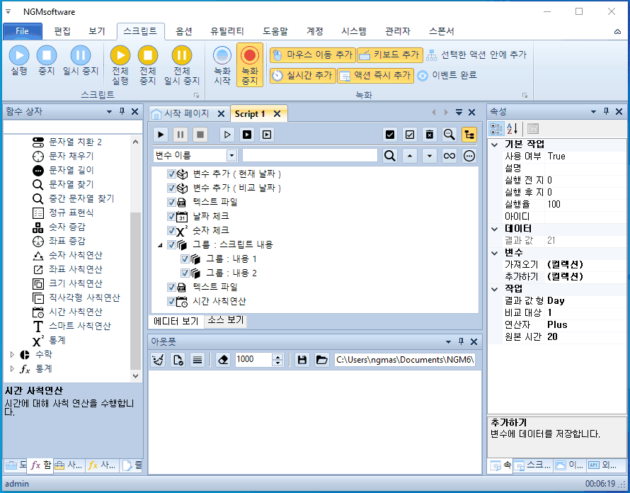 이번에는 결과를 좀 더 정확하게 확인할 수 있었습니다. 처음 실행할 때 날짜가 같으므로 그룹 액션들이 0.5초씩 지연을 가지고 실행되었습니다. 두번째 실행할 때는 마지막 종료 액션으로 이동합니다. 실제 매크로 또는 프로그래머들도 이런 종류의 코딩은 플래그(Flag)로 처리합니다. 날짜와 같은 경우에는 플래그로는 처리할 수 없어서 실제 날짜 값을 이용해야 하구요. 이 예제에 사용된 스크립트는 첨부되어 있으니 참고하시기 바랍니다.