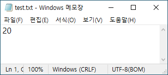 바탕화면에 test.txt 파일이 생성됩니다. 이 파일을 열어보면 오늘 날짜인 20 값이 저장되어 있습니다.
