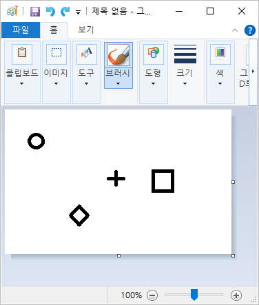이번에 새롭게 추가된 기능을 이용하면, 위 글에서 할 수 없었던 동작을 수행할 수 있습니다. [ 이미지 전체 매치 ]에는 이미 추가되어 있는 기능을 이미지 멀티 조건들에 적용했습니다. 이 테스트를 수행하기 위해 아래 그림과 같이 그림판에 동그라미, 사각형, 마름모를 그려줍니다. 그리고, 가운데에 중심점(십자가)을 그려 줬습니다.