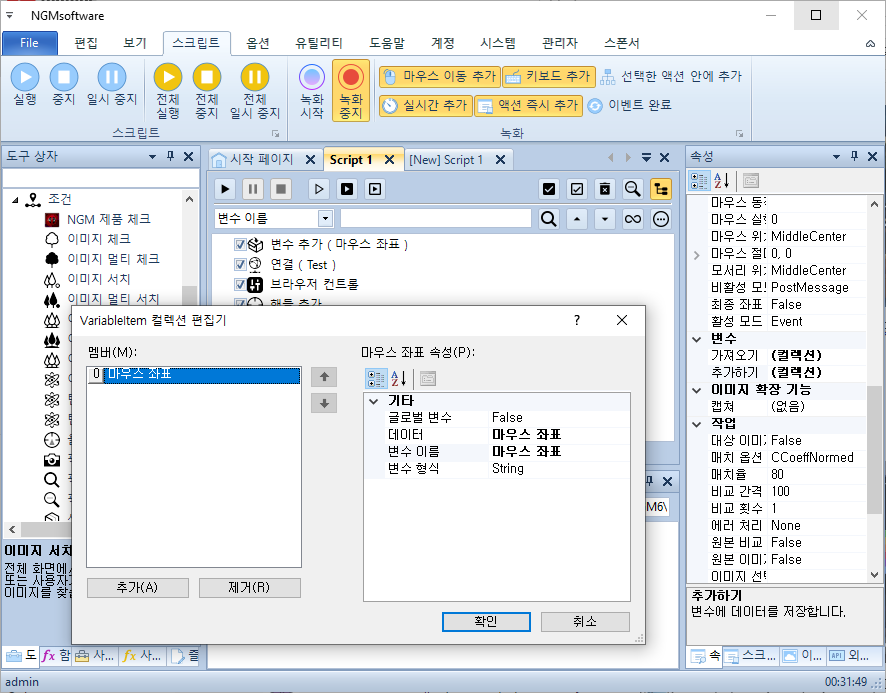 첫번째 변수 추가 (마우스 좌표) 액션은 비활성 방식으로 이미지를 서치하고, 마우스 좌표를 웹 API의 클릭으로 넘겨주기 위해 필요합니다. 데이타를 넘기려면 변수에 데이타를 저장해놔야 합니다. 다른 시점에 다른 액션이 이 값을 사용할 수 있도록 말이죠^^; 이 예제에서는 구글 로그인 버튼을 비활성으로 클릭합니다. 실제 테스트는 창을 최대화하고, 진행합니다.