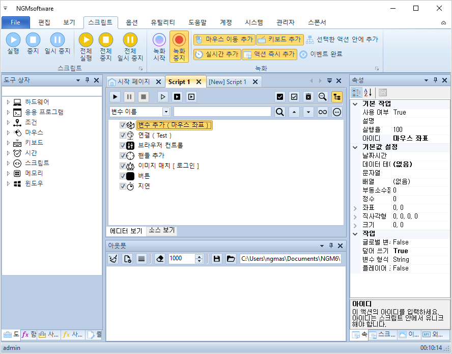 안녕하세요. 엔지엠소프트웨어입니다. 웹 업무를 비활성으로 처리하기는 쉽지 않습니다. 주식이나 선물 또는 코인 및 웹 게임들은 웹GL을 이용하거나 Canvas를 사용합니다. 동적(Dynamic)으로 그래픽을 처리하기 때문에 엘리먼트가 존재하지 않습니다. 기본적으로 자동화된 업무 툴(NGM, 오토핫키등등...)을 이용하면 비활성으로 그래픽을 분석해서 마우스로 클릭할 수 있도록 만들 수 있습니다. 이 예제를 학습하기 위해 엔지엠 에디터를 실행하고, 아래와 같이 새로운 스크립트를 하나 추가하세요. 아래 그림은 완성된 전체 스크립트입니다.
