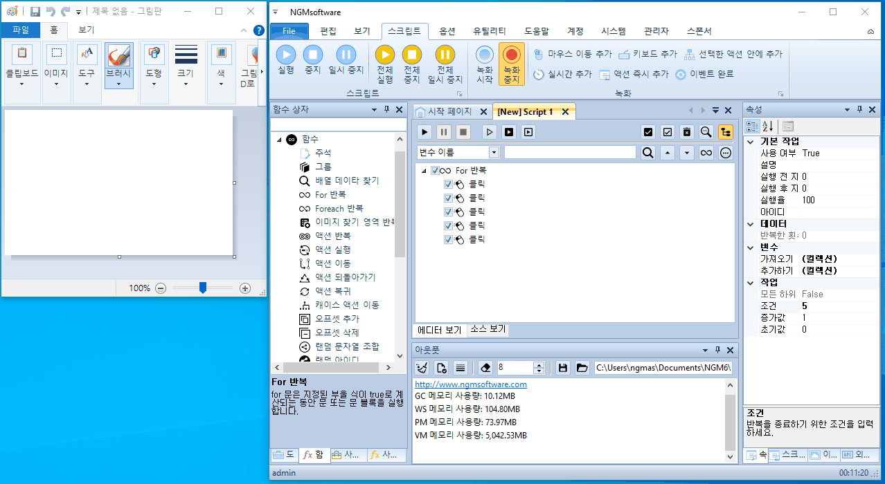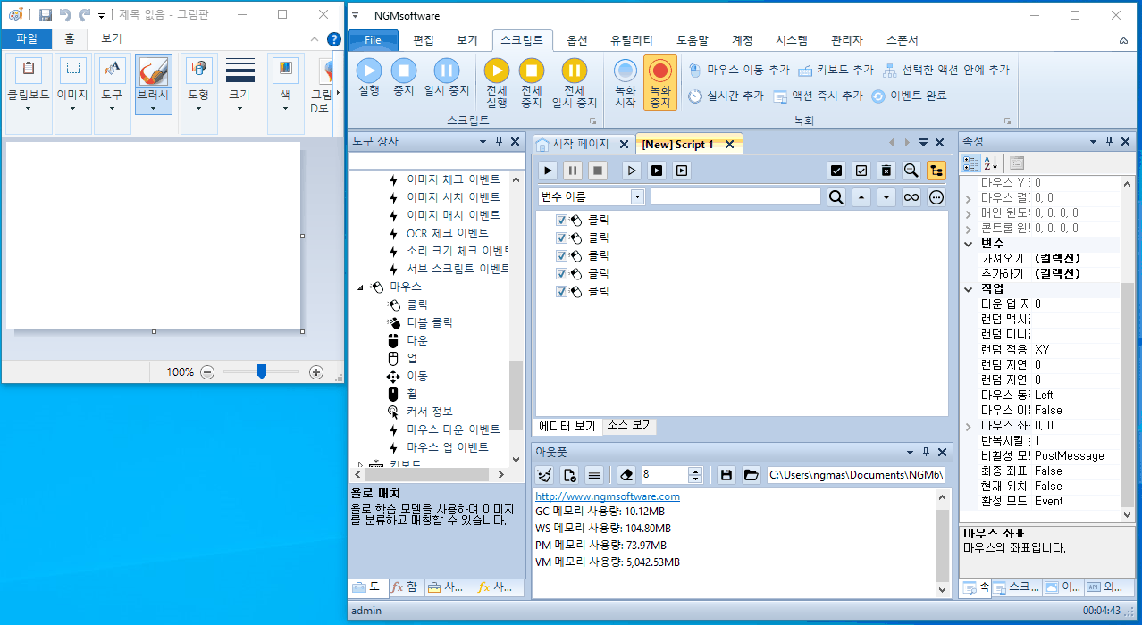 안녕하세요. 엔지엠소프트웨어입니다. 특정 영역에서 무작위로 랜덤하게 마우스를 클릭하고 싶으면 어떻게 해야 할가요? [ 이미지 서치 ]나 [ 이미지 매치 ]로 이미지 인식하기 어려운 경우에~ 대안으로 사용할 수 있는 방법입니다. 가장 좋은 방법은 딥러닝을 이용한 [ 욜로 매치 ]지만... 이건 단시간에 결과물을 내기가 쉽지 않습니다^^; 아래와 같이 엔지엠 에디터를 실행하고, 새로운 스크립트를 하나 추가하세요. 그리고, 그림판도 하나 같이 열어줍니다. 아래 동영상을 참고해서 각각의 좌표를 설정하세요.