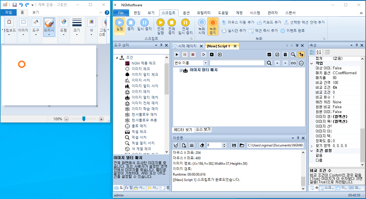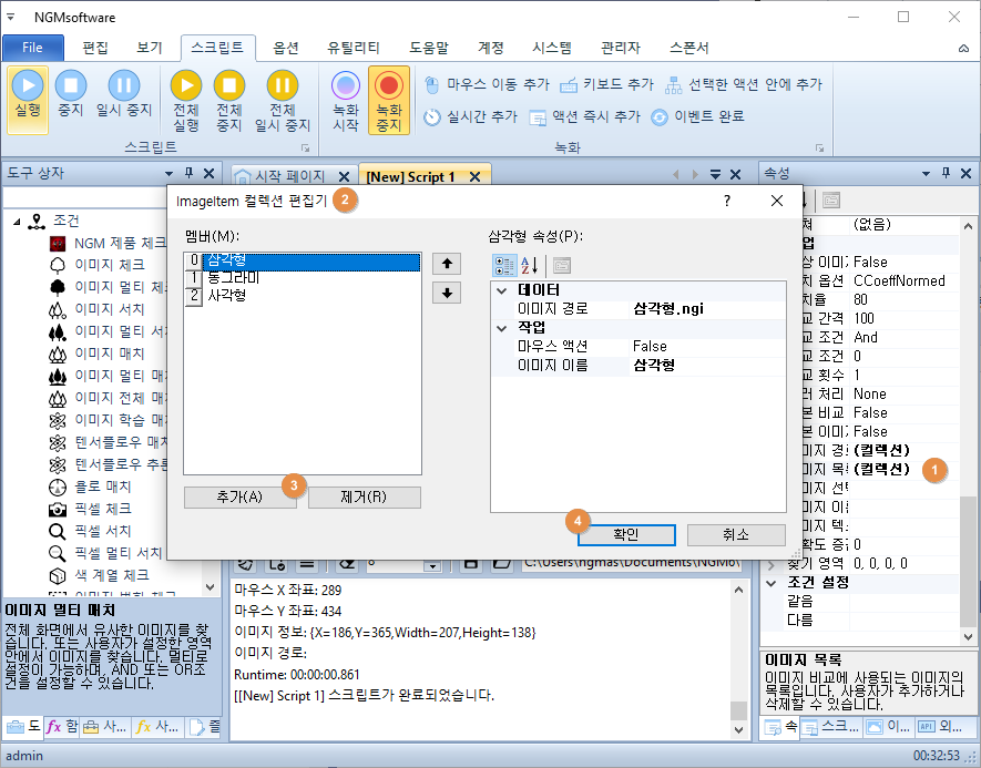 엔지엠 에디터를 실행하고, 아래 그림과 같이 이미지 멀티 매치 액션을 추가 해줍니다. 이 액션은 도구 상자의 조건 카테고리에 있습니다.