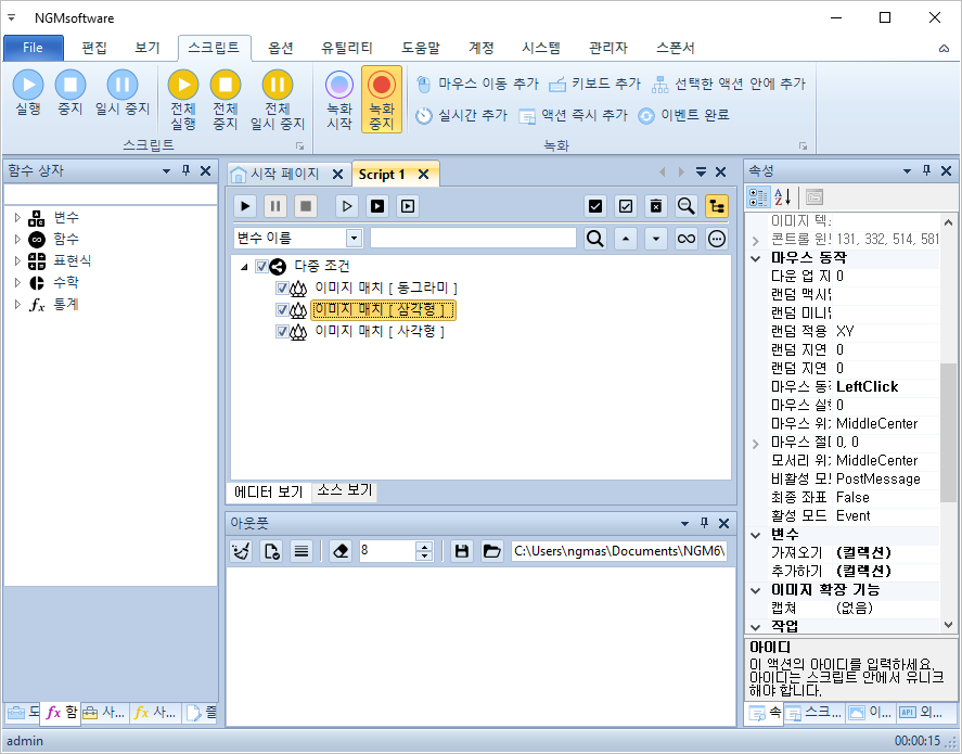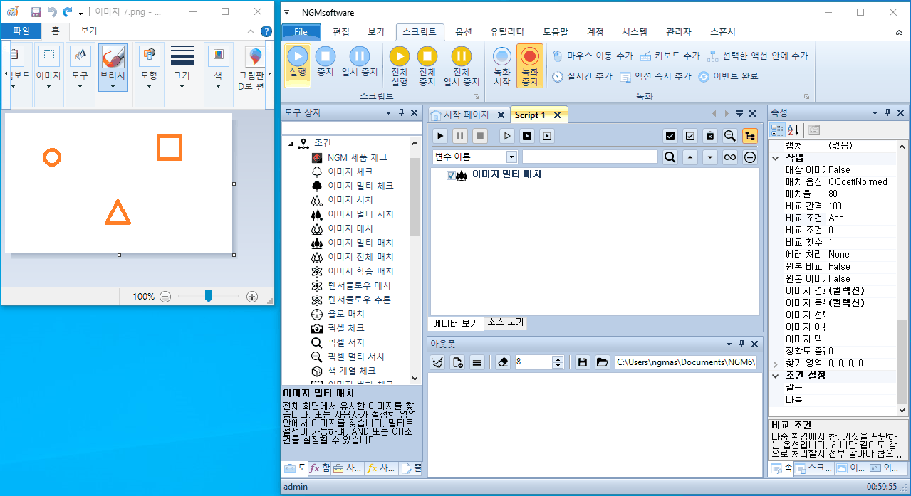 이 액션들에 마우스 동작은 각각 개별적인 동작이라는걸 이해해야 합니다. 예를 들어 동그라미, 삼각형, 사각형에 개별 클릭을 설정하고 조건을 Or로 해줍니다. 그러면, 처음 동그라미에서 이미 True이기 때문에 삼각형과 사각형은 클릭이 발생하지 않습니다. 이미지 멀티 매치 입장에서 조건에 이미 만족한 상태이기 때문에 나머지 이미지 매치 조건을 판단하지 않기 때문입니다. 반대로, And 조건의 개별 클릭을 설정한다고 생각 해보세요. 이때는 정상적으로 클릭이 수행됩니다. And 조건은 등록된 모든 이미지를 처리하고 좌표를 가지고 있기 때문입니다.