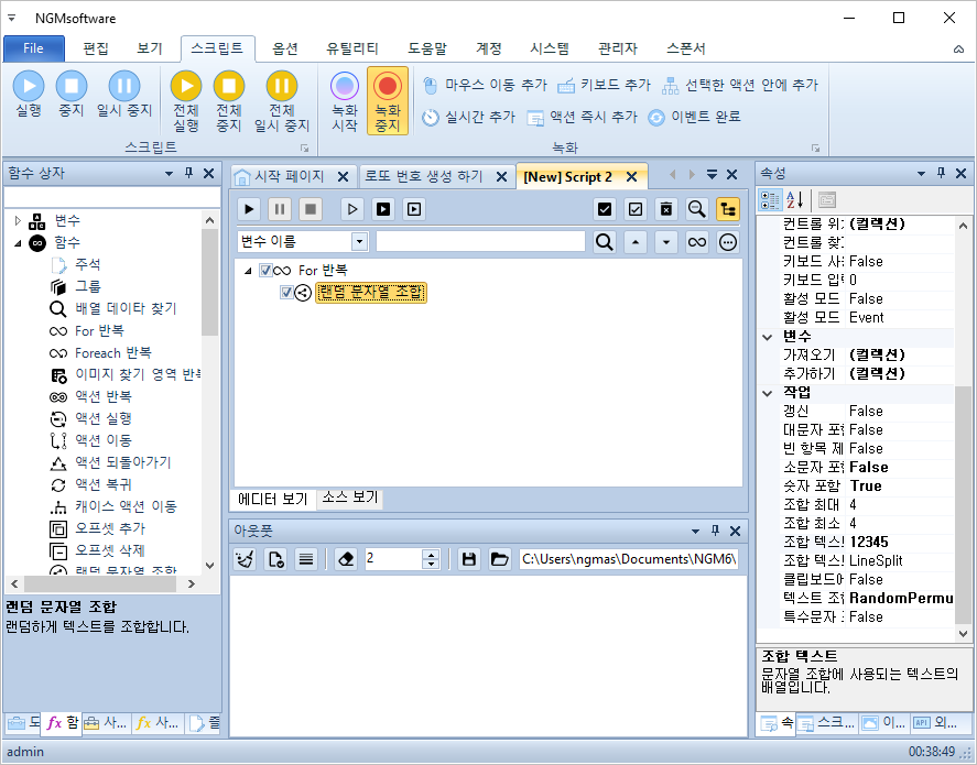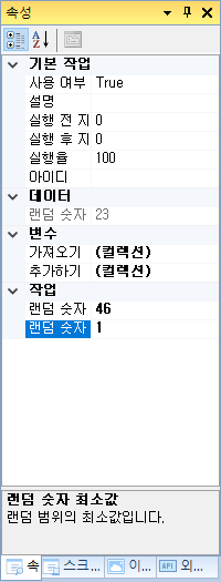 이번에는 [ 랜덤 문자열 조합 ] 액션을 추가하고, 아래와 같이 속성을 설정한 후 다시 테스트 해보세요.