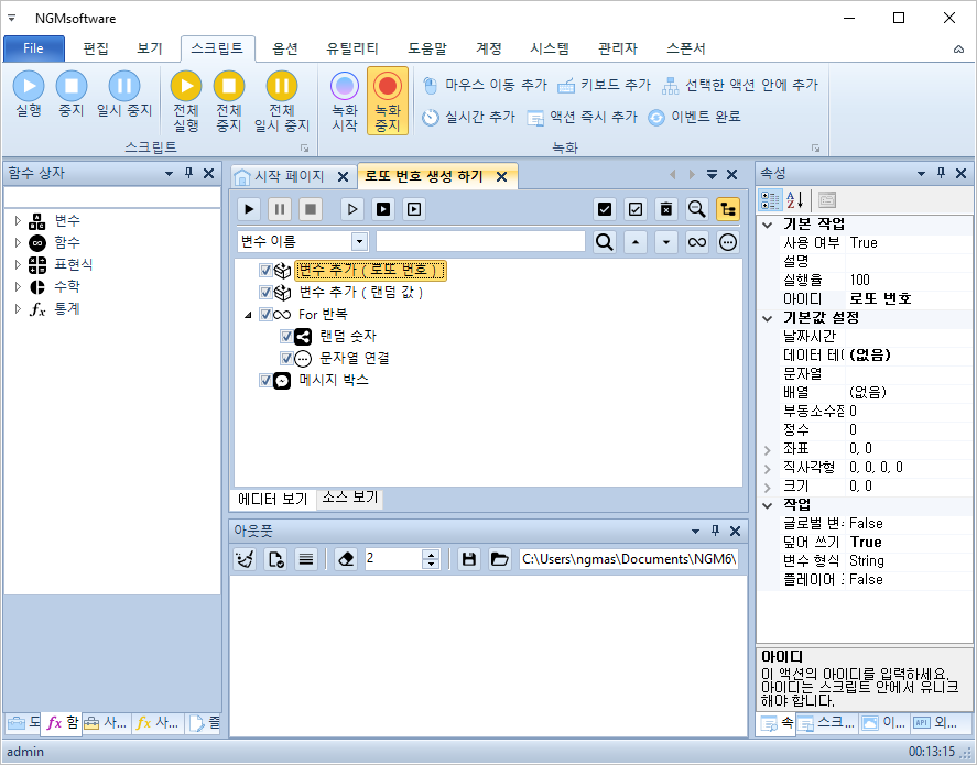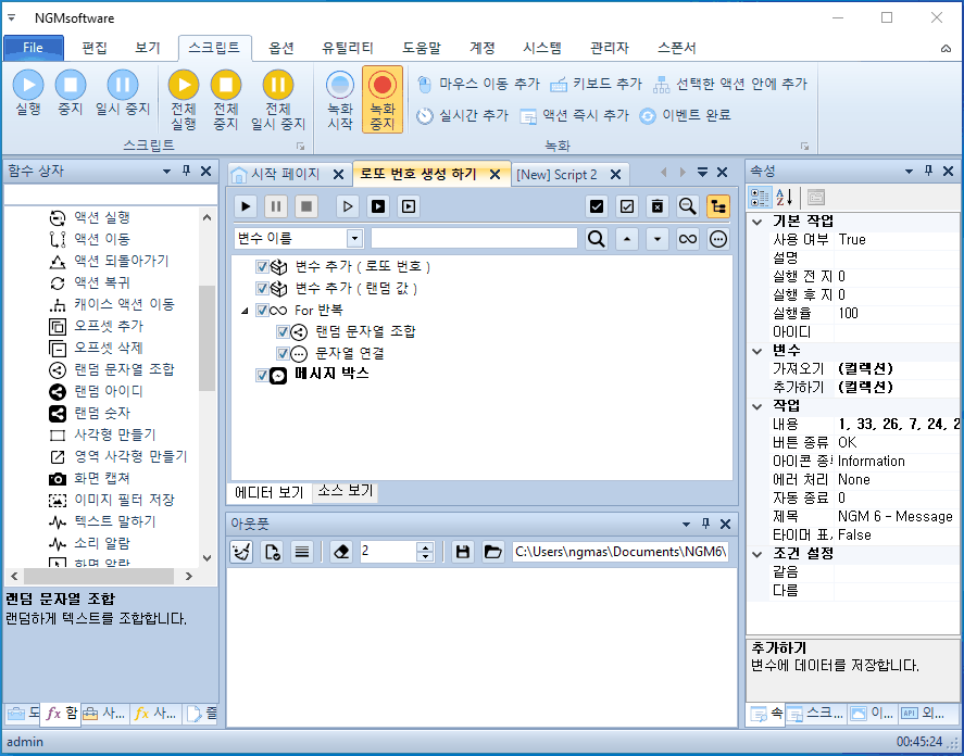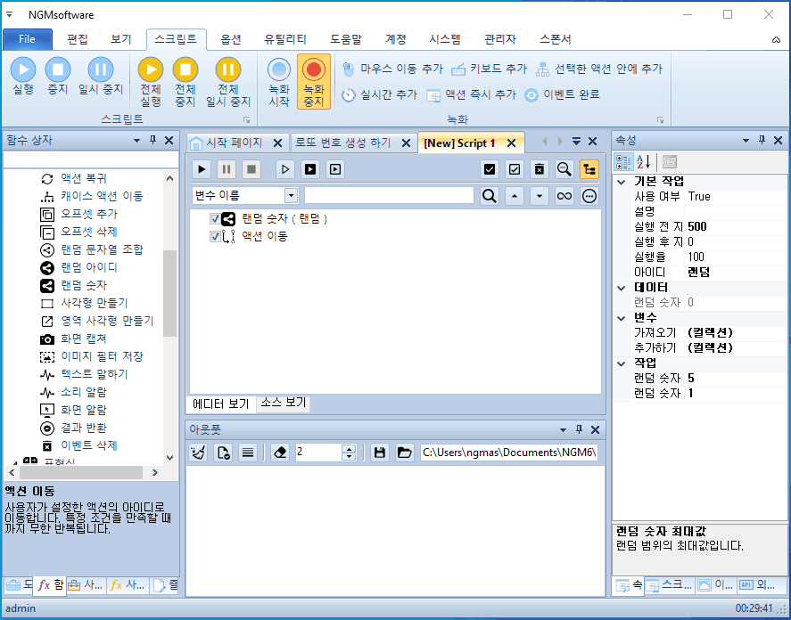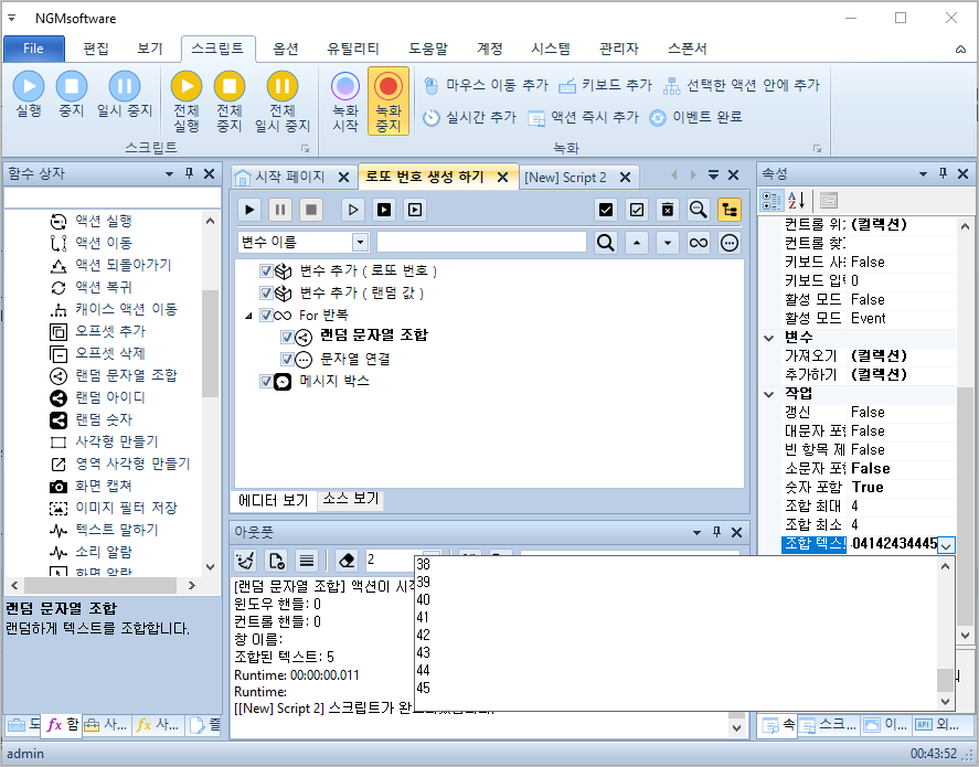 안녕하세요. 엔지엠소프트웨어입니다. 메크로를 이용한 랜덤 난수를 어떻게 만드는지 간단한 설명을 위해 이 예제를 만들었습니다. 단순히 랜덤 숫자를 만드는건 그리 어렵지 않거든요. 다만, 여러개의 난수를 조합해서 무언가 결과를 내려면 아래와 같이 만들어서 사용할 수 있습니다. 에디터를 실행하고, 첨부되어 있는 스크립트를 열어보세요. 아래와 같이 단순한 내용을 확인할 수 있습니다^^