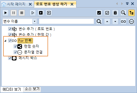 변수 로또 번호와 랜덤 값이 상단에 추가 되어 있는데요. 로또 번호는 랜덤 값을 6개까지 모아주는 변수입니다. 그리고, 난수를 6번 발생해야 하기 때문에 [ For 반복 ] 안에 [ 랜덤 숫자 ]와 [ 문자열 연결 ] 액션이 추가 되어 있습니다. 로또 번호가 6개라서 6번 반복해야 합니다.