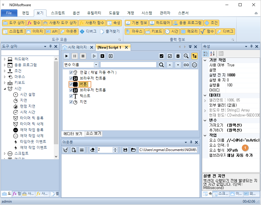 이 버튼을 클릭하기 위해서는 웹 API의 버튼 액션을 사용합니다. ①요소 형식을 XPath로 선택하고, 버튼의 엘리먼트 XPath를 입력 해줍니다.