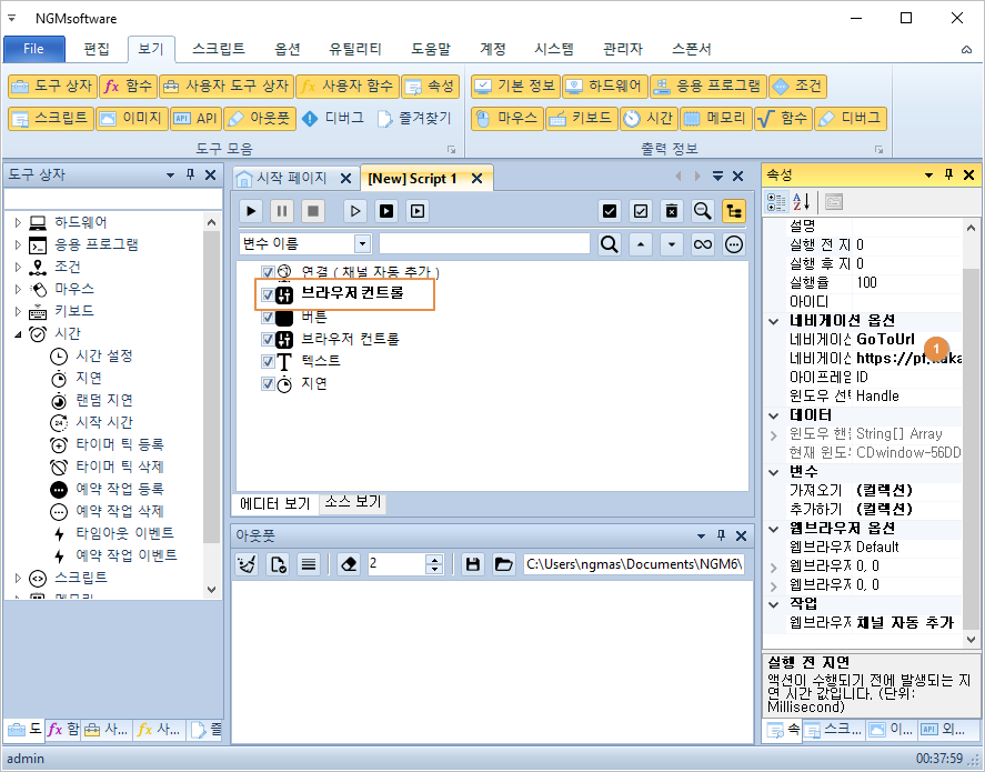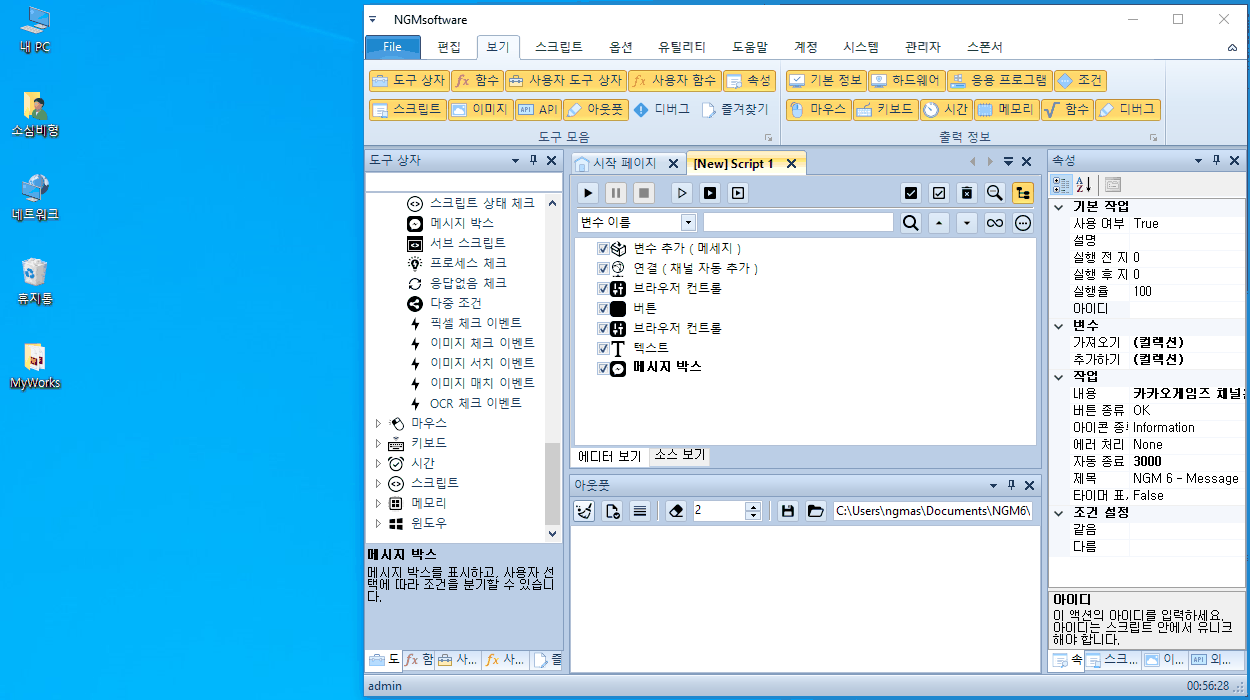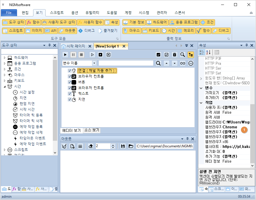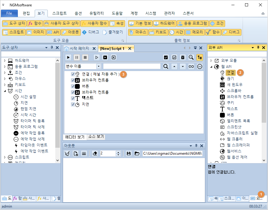 안녕하세요. 엔지엠소프트웨어입니다. 오늘은 홍보/마케팅용르로 카카오 채널에 자동으로 등록해주는 스크립트에 대해 알아보도록 하겠습니다. 수천개에 이르는 고객 정보를 자동으로 카카오 채널에 추가하는 스크립트인데요. 사람이 하나씩 처리하려면 몇일이 걸릴겁니다. 매크로를 사용하면 좀 더 빠르고 정확하게 업무를 완료할 수 있는데요. 꼭, 카카오 채널뿐만 아니라 페이스북 또는 인스타그램의 친구 추가나 좋아요를 눌러줄수도 있습니다. 이외에도 KB차차차나 카모두와 같은 매물 정보를 빠르게 가져올수도 있습니다. 요즘은 네이버 카페에 이벤트로 올라오는 경품에 응모한다거나 중고나라에 상품 등록하는것까지 가능하기 때문에 엔지엠 매크로의 활용성이 상당히 좋죠^^ 일단, 테스트를 위해 아래와 같이 에디터를 실행하고, 새로운 스크립트를 하나 추가 해줍니다.
