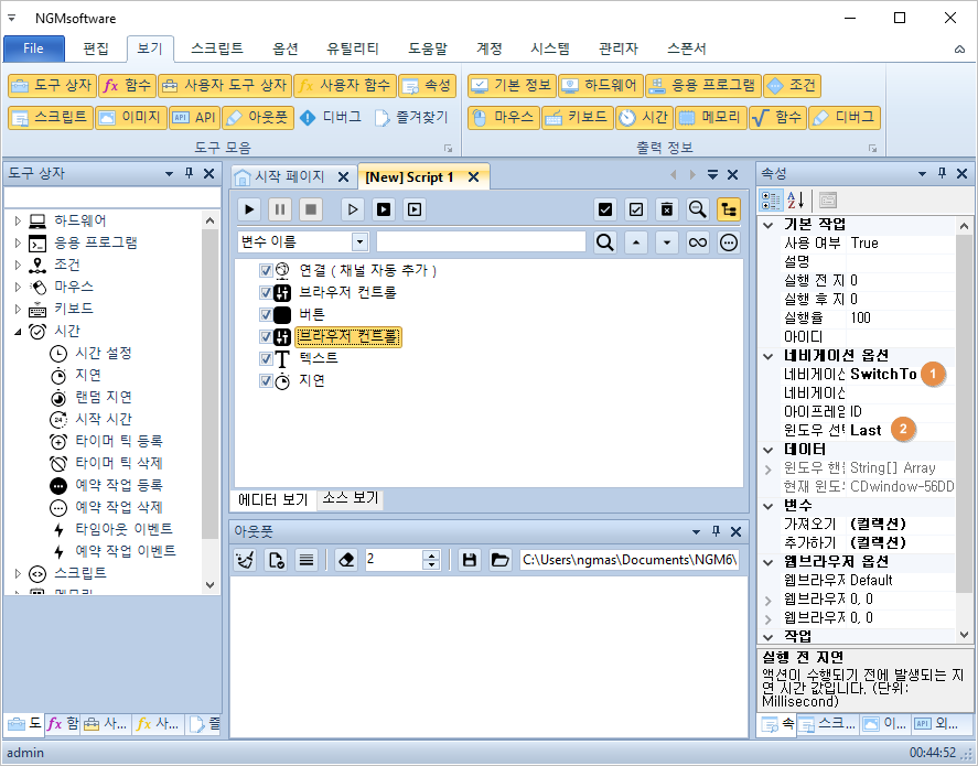 여기서 주의할점은 채널 추가 버튼을 누르면 자체 화면이 전환되는게 아닌 새로운 탭에서 창이 표시된다는 점입니다. 웹 API의 기본적인 동작은 하나의 세션(창) 안에서만 제어가 가능하다는 것입니다. 그렇기 때문에 새로운 탭 또는 창이 열렸을 때는 해당 창으로 제어권을 이동시켜야 다음 동작을 정상적으로 수행할 수 있게 됩니다. 여기서 제어권을 이동하는 창은 새로 생성된 탭이므로 아래와 같이 간단하게 처리가 가능합니다. 버튼 아래에 브라우저 컨트롤 액션을 하나 더 추가한 후 ①SwitchTo를 선택하세요. 그리고, ②Last를 선택 해줍니다. 마지막 창(Last) 또는 탭으로 전환(Switch to) 해준다는 뜻입니다.