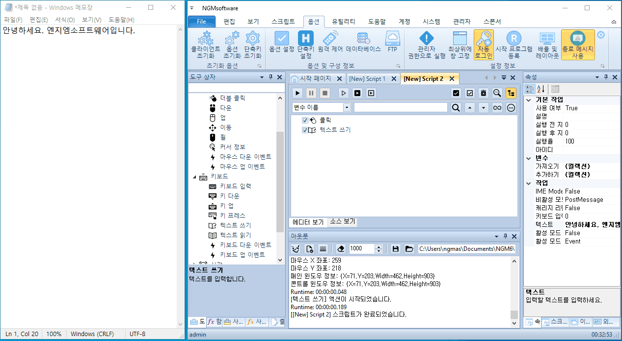 - 우측 속성 > 텍스트에 "안녕하세요. 엔지엠소프트웨어입니다."를 입력 후 실행(Ctrl+Alt+F8) 버튼을 클릭하세요.