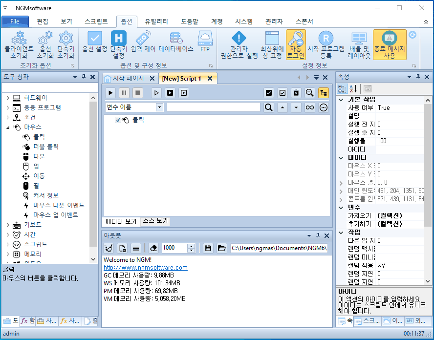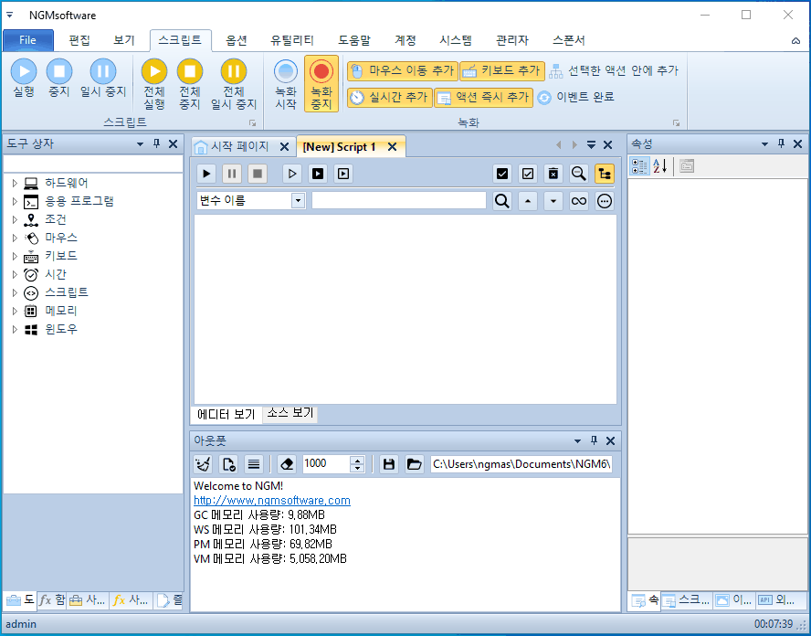 안녕하세요. 엔지엠소프트웨어입니다. 처음 매크로 프로그램을 접하면 이걸 어디서부터 어떻게 만들어야 할지 감이 오지 않을겁니다. 개발자라면... 매뉴얼의 도움말을 참고해서 쉽게 가능하지만~ 비개발자는 도움말을 읽어봐도 도통 이게 무슨 소리인지 잘 이해가 안갈거에요. 사람마다 차이는 있지만, 컴퓨터를 접해보지 않은 분들을 대상으로 작성되는 글이니 가장 기초적인 내용으로 시작하겠습니다. 우선, 엔지엠 에디터를 실행하고 새로운 스크립트를 추가 해줍니다.