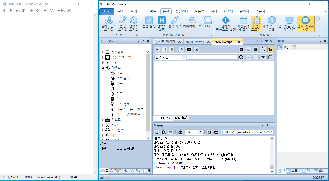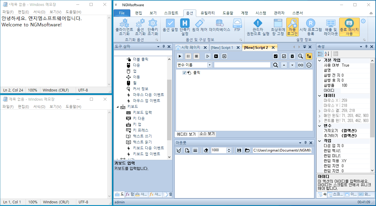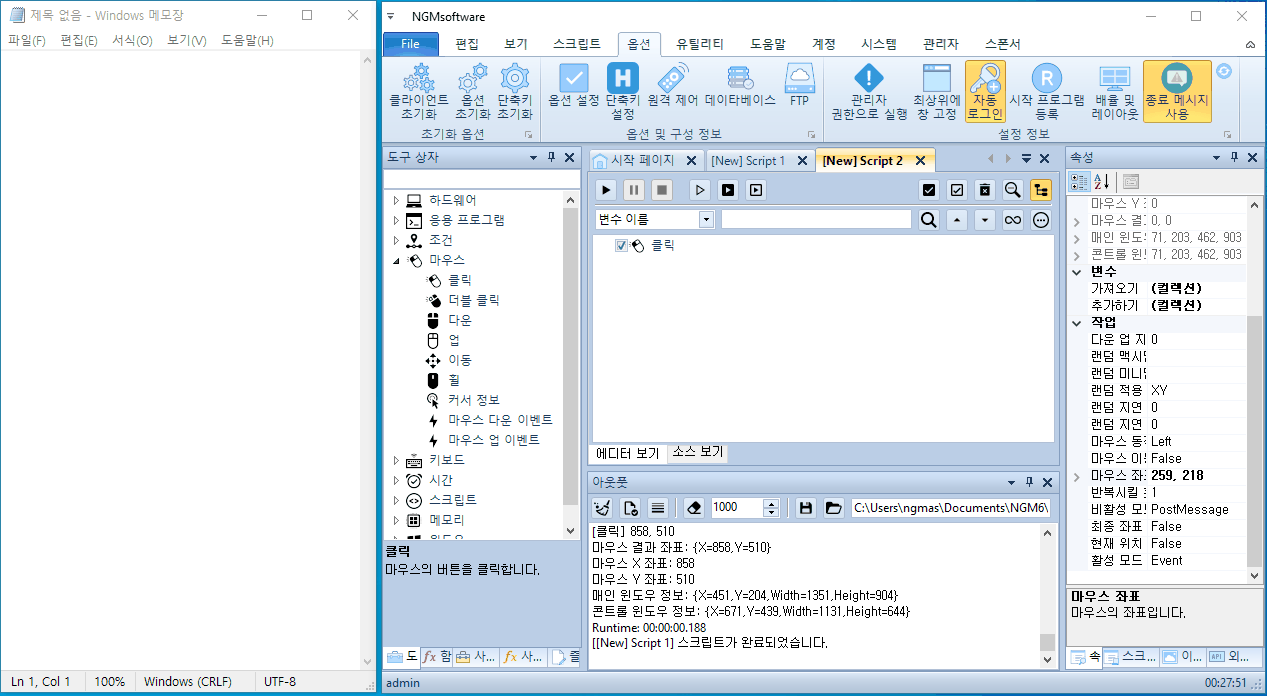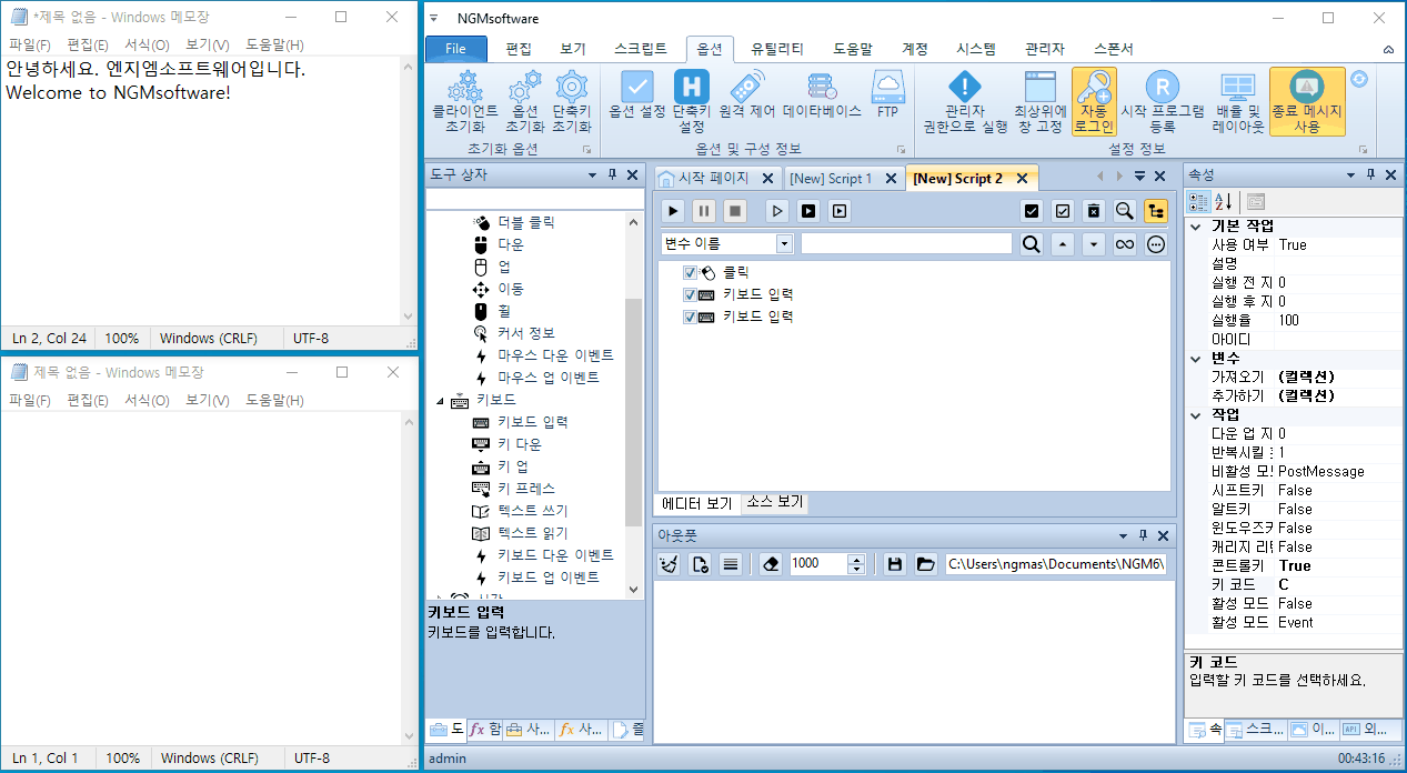 이번에는 키보드 동작에 대해 알아볼까요? 키보드도 마우스 액션과 크게 다르지 않습니다. 다만, 클릭이 아닌 키보드의 키를 누르기 때문에 몇가지 옵션이 더 추가 되어 있습니다. Ctrl+N을 눌러서 새로운 스크립트를 추가하세요. 메뉴의 File > 새로 만들기 > 스크립트로 추가해도 됩니다. 키보드를 학습해야 하기 때문에 메모장을 옆에 띄워놓고, 마우스로 제목을 클릭하게 해줍니다. 이렇게하는 이유는 키보드는 활성 창에만 입력할 수 있기 때문입니다. 예를 들어서 네이버 또는 구글에서 검색한다고 생각 해보세요. 검색창을 클릭한 후 키보드를 입력하죠? 이 예제도 동일합니다. 입력할 수 있는 프로그램이 선택되어 있어야 하기 때문에 메모장을 클릭하는 액션을 미리 추가해놓은겁니다^^