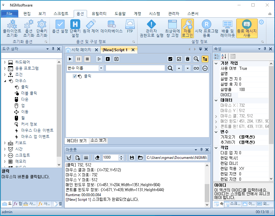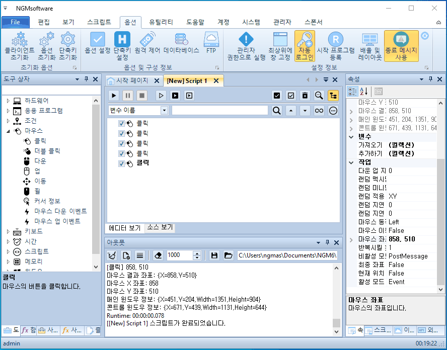 - 좌측 도구 상자 > 마우스 > 클릭 선택 후 드래그하여 스크립트에 추가하세요.