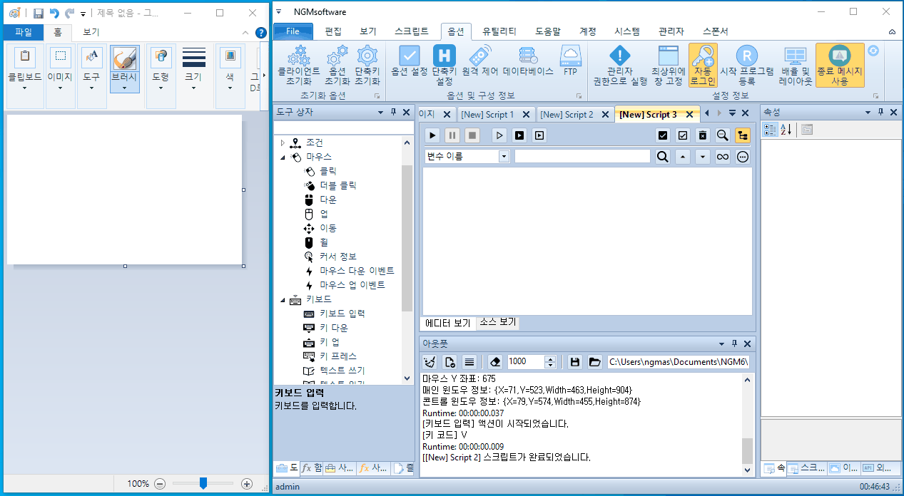 이외에도 다양하게 응용해서 처리할 수 있습니다. 이제 가장 많이 사용하는 이미지를 찾아서 클릭하는 방법에 대해 알아보도록 하겠습니다. 사실 매크로의 가장 핵심은 화면의 이미지를 인식해서 해당 위치를 마우스로 클릭하는 겁니다. 엔지엠 매크로를 사용하면 이 복잡한 작업을 아주 쉽게 처리할 수 있습니다. 다시 새로운 스크립트를 추가하고, 테스트를 위해 그림판을 하나 추가 해줍니다. 그림판에서 클릭이 잘 되는지 확인하기 위해 아래와 같이 설정 해줍니다.
