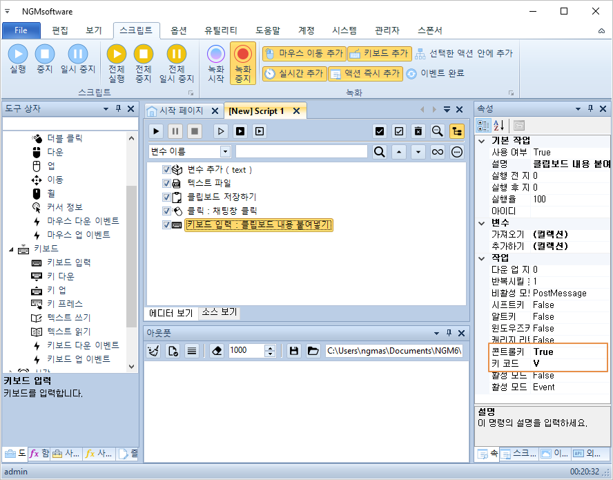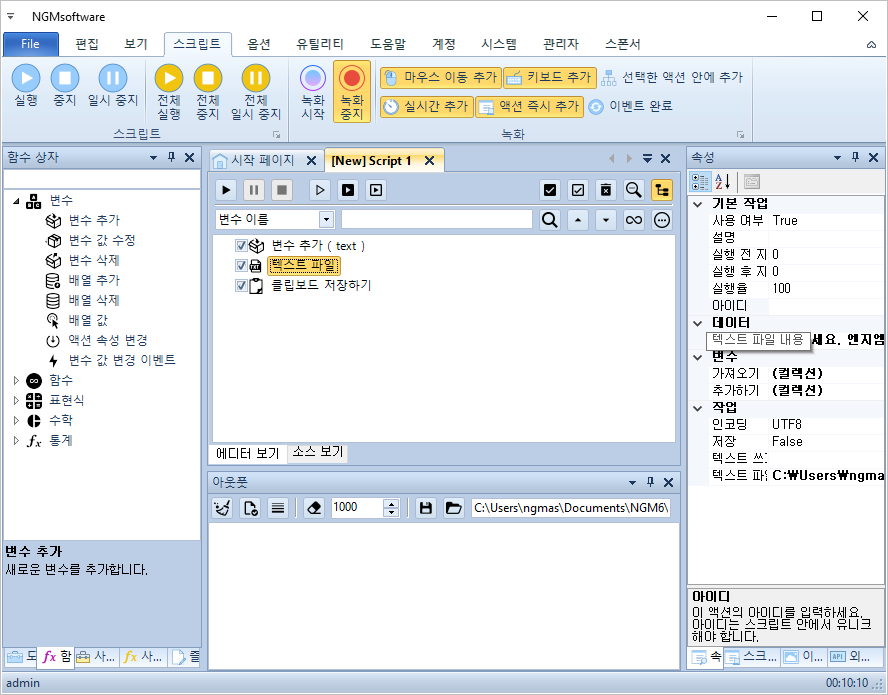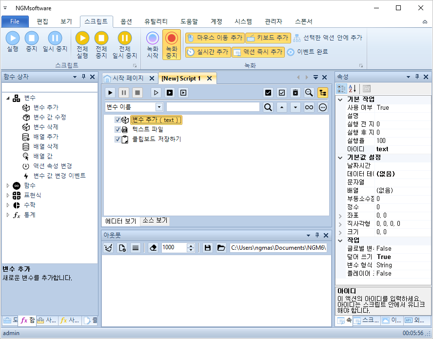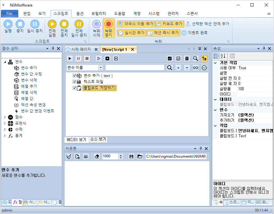 안녕하세요. 엔지엠소프트웨어입니다. 홍보 또는 마케팅 용도로 매크로를 사용하시는 분들은 홍보 멘트를 텍스트 문서에 저장해두고, 관리하는 고객들의 채팅에 각각 붙여넣기를 해야 하는 업무가 많을겁니다. 아래 내용은 간단하게 시나리오를 매크로로 만들어본건데요. 실제 사용하는 환경에 맞게 수정해서 쓰시면 도움이 될거 같습니다. 우선, 에디터를 실행하고 새로운 스크립트를 하나 추가하세요. 그리고, 아래 그림과 같이 스크립트를 구성해줍니다.