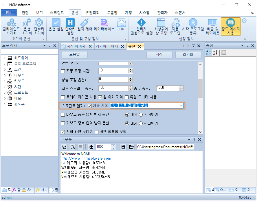 위 동영상에서 재시작하면서 로그인창이 표시됩니다. 완전 무인 자동화를 하려면 자동 로그인을 사용해야 합니다. 그리고, 옵션에서 재시작 시 시작할 스크립트를 선택해야 합니다. 아래 그림과 같이 옵션을 열고 스크립트 열기에 체크 후 실행할 스크립트를 선택해야 합니다. 완전 무인 자동화 구축에 대한 자세한 내용은 [ 여기 ] 를 참고하세요.