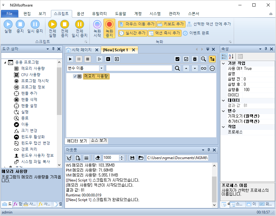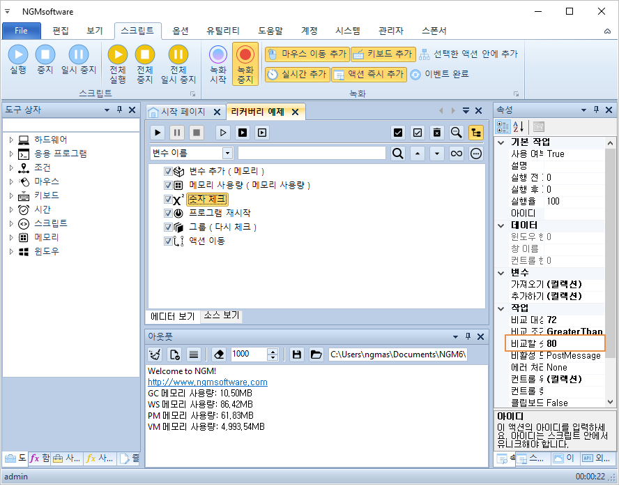 전체적인 구성은 아래 그림과 같습니다. 비교할 숫자에 최대 메모리 사용량을 적어줍니다. 이 예제에서는 80메가 이상 사용하면 에디터를 재시작하게 했습니다.