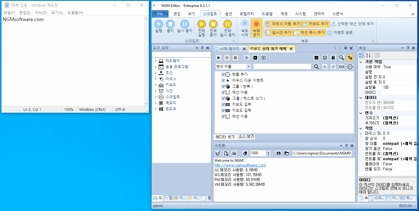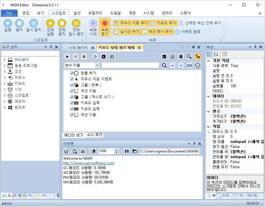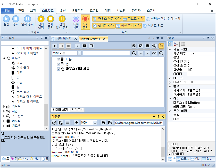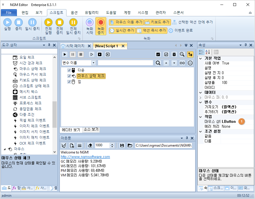 안녕하세요. 엔지엠소프트웨어입니다. 오늘은 마우스의 상태를 체크할 수 있는 [ 마우스 상태 체크 ] 액션에 대해 알아보도록 하겠습니다. 키보드의 상태 체크 방법에 대해 궁금하다면~ [ 여기 ]를 참고하세요. 이 예제를 실습하기 위해 에디터를 실행하고, 새로운 스크립트를 하나 추가 해줍니다.