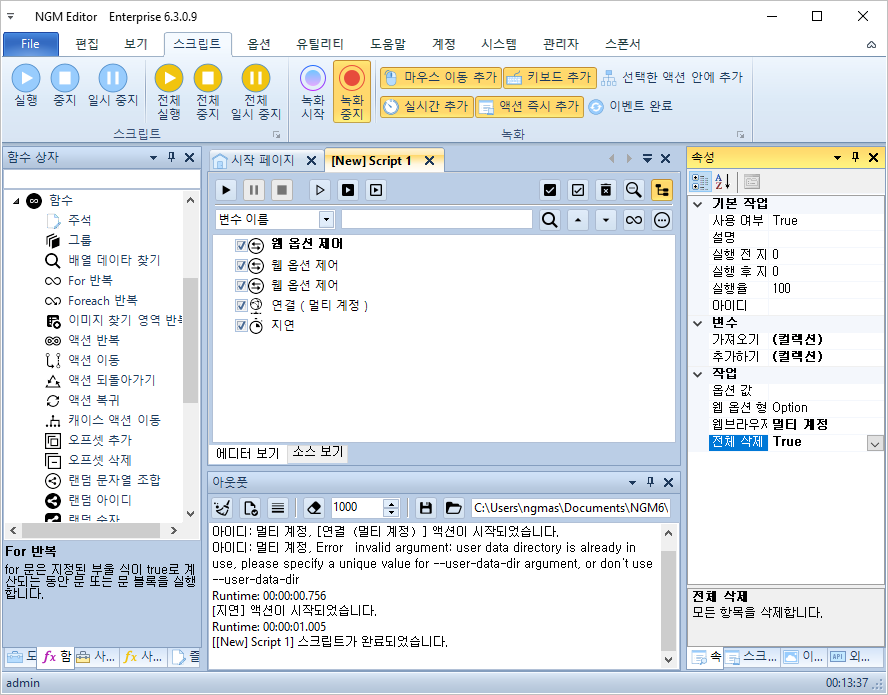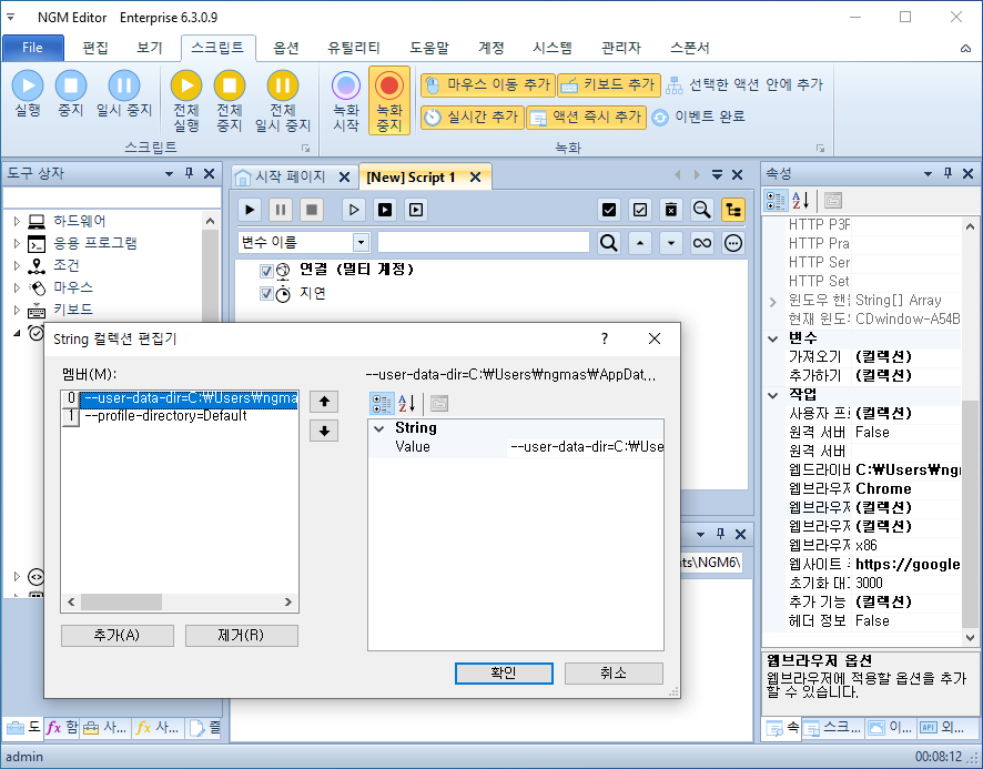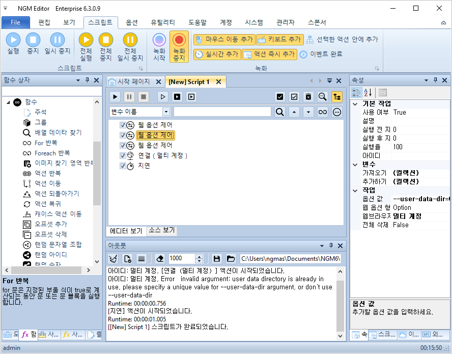 저 그러면~ 수많은 계정들을 하나씩 실행하면서 업무를 자동화할 때 어떻게 해야 할까요? 연결 액션의 옵션을 엑셀이나 데이타베이스에 저장된 내용을 가져와서 넣어줘야 합니다. 이 방법을 사용하려면 아래와 같이 옵션을 수동으로 처리할 게 아니라 [ 변수 ]와 [ For 반복 ] 또는 엑셀이나 데이타베이스 반복을 사용해야 합니다. 웹 연결의 옵션을 제어하는 "웹 옵션 제어" 액션을 추가하세요.